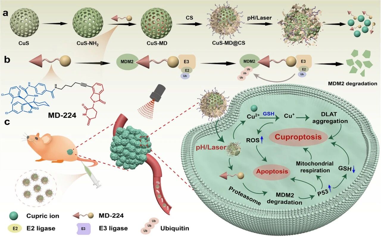 1.本研究首创性地构建了基于蛋白水解靶向嵌合体(PROTAC)的铜死亡增敏剂CuS-MD@CS,将PROTAC这一前沿蛋白质降解技术引入铜死亡调控领域,通过泛素-蛋白酶体系统精确调控p53蛋白表达,从而实现对肿瘤细胞内源性谷胱甘肽的耗竭及糖酵解向线粒体呼吸的代谢表型逆转,有效解决了因肿瘤高GSH水平和Warburg效应所导致的铜死亡疗效受限这一核心难题。2.CuS-MD@CS设计体现了多重机制协同增敏的策略创新,不仅借助铜离子释放直接触发铜死亡及活性氧生成,还通过PROTAC介导的p53蛋白动态降解间接干扰细胞代谢平衡,这种双向作用既强化了铜死亡的诱导效率,又克服了肿瘤代谢适应性,为铜死亡疗法提供了兼具精准性与广谱性的增强路径。