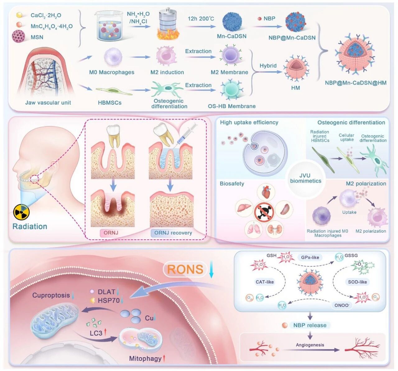 颌骨放射性坏死 (ORNJ) 会导致使人衰弱的并发症,而目前的疗法有组织损伤和血管功能不全的风险。在此,通过用来自 M2 巨噬细胞和成骨诱导的人骨髓间充质干细胞 (HBMSCs) 的杂化膜 (HM) 涂覆 Mn/Ca 双原子位点纳米酶 (Mn-CaDSN) 来开发颌骨血管单位 (JVU)仿生纳米酶。Mn-CaDSN 表现出协同的超氧化物歧化酶样、过氧化氢酶样和谷胱甘肽过氧化物酶(GPx)样活性,Mn-CaDSN 的最大 GPx 样催化活性比 Mn 单原子对照高 2.1 倍。密度泛函理论计算表明,Ca 位点通过 d 波段中心调制优化了底物吸附和 O─H 键裂解。HM 涂层能够靶向 JVU 递送,增强细胞摄取并重新编程辐照的巨噬细胞,使其达到 M2 极化和成骨分化。在辐照细胞中,纳米酶同时消除活性氧/氮(RONS),激活线粒体自噬,并抑制 cuproptos。负载的 Dl-3-n-丁基邻苯酞 (NBP) 进一步增强体内血管生成。在大鼠 ORNJ 模型中,NBP@Mn-CaDSN@HM 通过重新平衡免疫-血管-成骨微环境促进粘膜愈合并增加骨体积分数。这项工作建立了与双原子纳米酶相结合的 JVU 仿生学范式,用于综合 ORNJ 治疗。