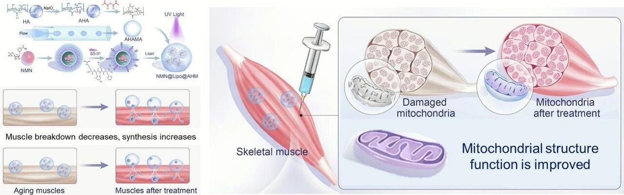 肌少症是一种退行性骨骼肌疾病,与衰老密切相关,其特征是肌肉质量和功能的逐渐流失,严重影响老年人的生活质量。总体而言,肌少症的严重程度因患者和肌肉群而异,增加了肌少症治疗的复杂性和挑战。基于肌少症的核心病理机制,即由烟酰胺腺嘌呤二核苷酸(NAD(+))诱导的线粒体功能障碍,本研究开发了一种新型能量补充水凝胶微球(NMN@Lipo-s@AHM),通过局部注射向肌肉细胞靶向递送。通过脂质体包裹增强了 NMN 的稳定性,SS-31 肽用于线粒体靶向,并通过醛透明质酸甲基丙烯酸水凝胶微球(AHM)实现持续局部释放。体外和体内实验表明,补充能量的水凝胶微球显著缓解了地塞米松引起的线粒体功能障碍和肌肉细胞中的衰老表型。转录组和蛋白质组分析显示,水凝胶微球通过激活“AMPK-SIRT1-PGC1α”信号通路调控线粒体功能,协同改善线粒体能量代谢和细胞衰老。本研究不仅提供了高效的靶向 NAD+ 补充策略,还为肌少症的机制研究和临床干预提供了新方向。