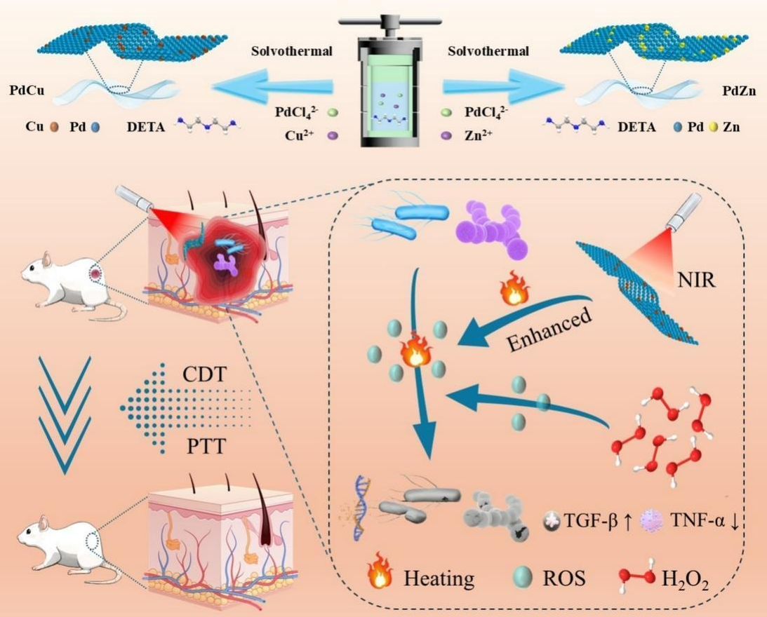 抗生素的滥用加剧了细菌耐药性问题,使抗生素治疗无效,在严重情况下甚至存在生命危险。因此,新型抗菌材料和其临床应用受到了医疗保健专业人士的高度关注。双金属纳米酶在治疗临床细菌感染方面具有巨大潜力,这得益于其优异的抗菌活性和良好的生物相容性。在本研究中,通过一步水热法合成了具有折叠结构的 PdZn 和 PdCu 双金属纳米酶。比较了它们的 photothermal 和过氧化物酶样催化活性,并通过计算研究分析了它们催化性能差异的原因。此外,还评估了这两种纳米酶的抗菌功效和伤口愈合潜力。实验结果表明,与 PdZn 相比,PdCu 表现出更优越的催化性能,这与密度泛函理论计算确认其增强的催化能力一致。 体外抗菌实验成功证明,PdZn 和 PdCu 通过利用 980 nm 近红外激光光热催化的协同效应,可以有效抑制大肠杆菌和金黄色葡萄球菌的存活,将其降至 2%以下。体内抗菌实验表明,PdZn 和 PdCu 纳米酶可以促进伤口愈合并减缓炎症反应。与 PdZn 相比,PdCu 在促进伤口愈合方面表现出更优越的能力。PdCu+H2O2+NIR 和 PdZn+H2O2+NIR 分别将创伤面积降至 9.37%和 6.04%,而对照组仅降至 41.21%。总体而言,这项研究进一步探索了基于 Pd 的纳米酶在生物应用中的潜力,并为合成高效 Pd 基二维纳米生物材料提供了指导。
