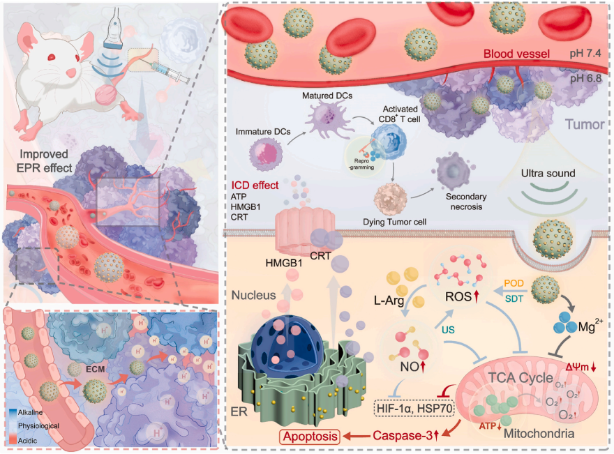 除了卓越的穿透能力,ML NPs还具备多功能的协同治疗效应。其中,MgF₂成分具有类过氧化物酶活性,可在肿瘤内源性过氧化氢存在下催化产生具有细胞毒性的羟基自由基。在超声波照射下,这一过程被进一步放大,产生的活性氧不仅可直接杀伤肿瘤细胞,还能氧化L-精氨酸产生一氧化氮气体,实现声动力治疗与气体治疗的协同。此外,纳米颗粒释放的镁离子能与肿瘤细胞表面的共刺激分子LFA-1结合,从而增强CD8⁺ T细胞的特异性杀伤功能,激活抗肿瘤免疫应答。