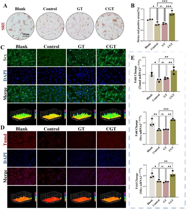 在体外实验中,研究团队在IL-1β诱导的炎症环境下测试了CGT水凝胶对腱干细胞/祖细胞(TSPC)功能的影响。研究发现,CGT水凝胶能够显著改善TSPC的功能障碍,上调包括Scx、Tnmd和Mkx在内的腱源性标志物表达水平,并促进胶原蛋白的合成。