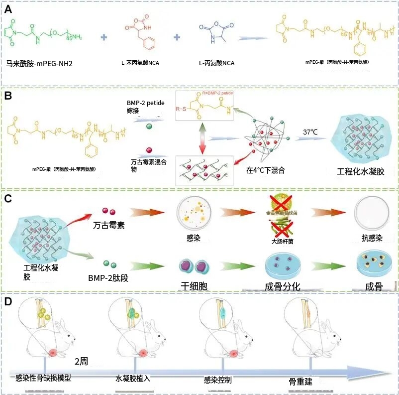 本研究通过开环聚合构建特定组分的水凝胶,分别通过BMP-2肽移植与万古霉素加载赋予其成骨特性与抗菌特性,进而构建双功能工程化水凝胶;对该水凝胶开展体外表征、生物相容性分析及抗菌与成骨特性评估,并利用兔子感染性骨缺损模型验证其体内治疗效果。
