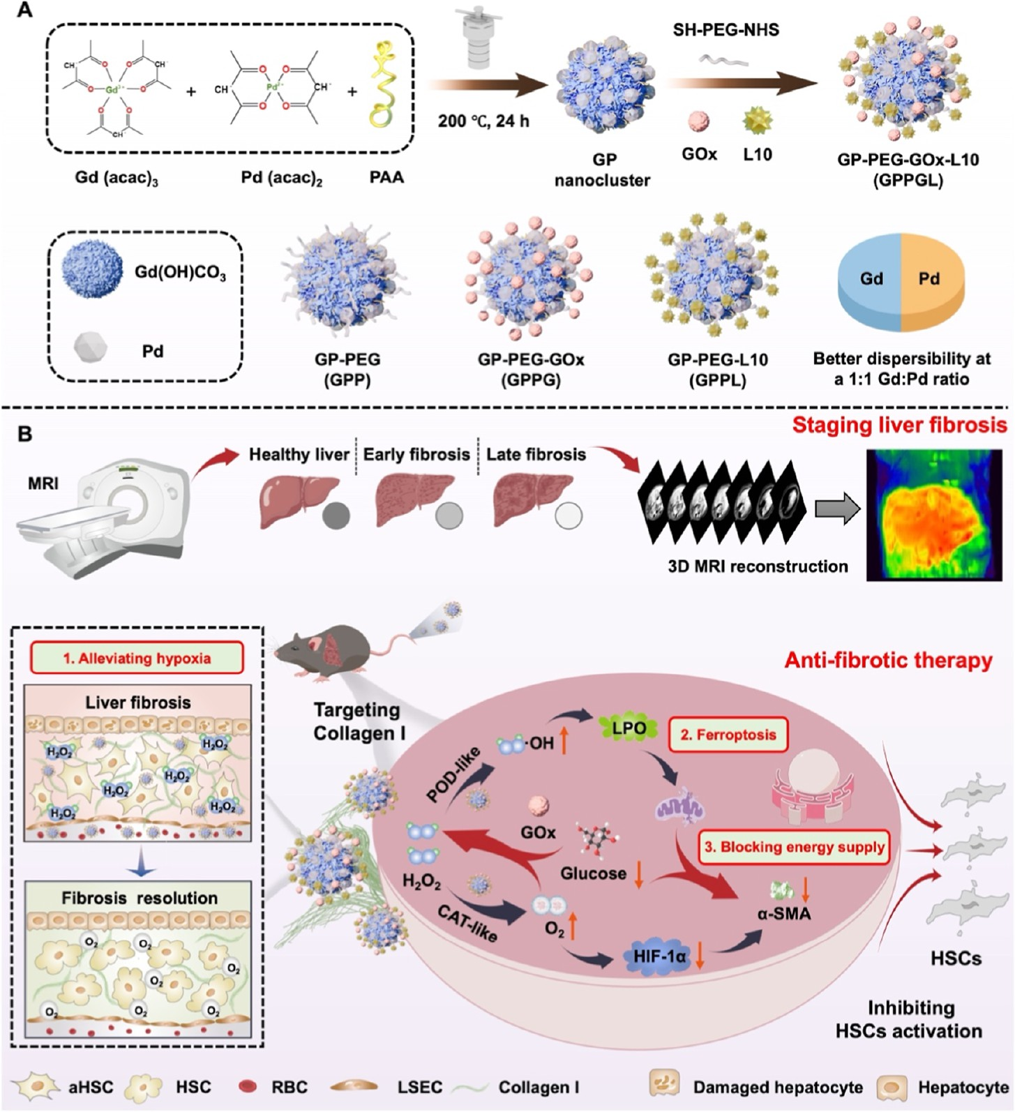 肝纤维化是一种慢性、进展性的肝病,可能导致不可逆的肝硬化和肝细胞癌。然而,肝纤维化的早期准确诊断仍是临床研究中的难题。本研究开发了钆-钯纳米簇,结合脱啰肽(L10)和葡萄糖氧化酶(GOx)移植(GPPGL),用于准确肝纤维化分期及协同抗纤维化治疗。L10 对胶原蛋白 I 具有强烈亲和力,可以介导该纳米平台靶向肝纤维化区域,使其在肝脏中积累得更强。因此,GPPGL 具有磁共振成像(MRI)对比增强能力,可以精确地分级肝纤维化的不同程度。随后,进一步对 MRI 图像进行三维重建和直方图特征分析,定量和定性地分析肝纤维化程度。GOx 具有高葡萄糖消耗,可以级联反应增强纳米平台的过氧化物酶样活性。GPPGL 的系统递送可协同抑制肝星状细胞的活化,减少其胶原蛋白生成,通过缓解肝纤维化缺氧、诱导铁坏死和实现饥饿治疗。在组织学和血液学检查中均未观察到显著副作用。因此,GPPGL 在实现肝纤维化分期准确和协同抗纤维化治疗方面具有前景。