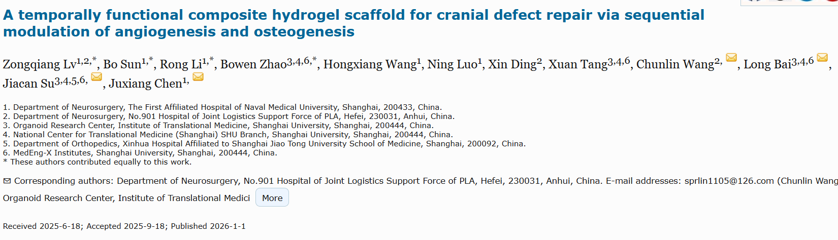 本文研究了一种用于颅骨缺损修复的时间功能性复合水凝胶支架,该支架能够通过顺序调节血管生成和骨生成来促进血管化骨的再生。传统骨修复材料往往作为惰性填充物,难以动态协调骨再生过程中不同生物学事件发生的时序。本研究针对这一挑战,设计了一种基于丝素蛋白的复合水凝胶系统,整合了载有丹酚酸B的缓释水凝胶和矿化丝素蛋白水凝胶微球,通过组分的差异降解动力学,实现了“先促进血管生成,后增强成骨”的仿生修复过程。相关工作以题为《A temporally functional composite hydrogel scaffold for cranial defect repair via sequential modulation of angiogenesis and osteogenesis》发表于国际期刊 Theranostics。