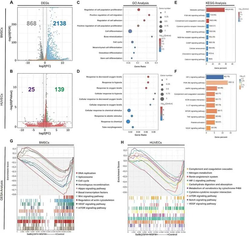 支架采用了功能模块化的设计思路。载有丹酚酸B的水凝胶模块主要负责早期招募内皮细胞、促进血管形成;而矿化水凝胶微球模块则模拟骨基质的微环境,为骨髓间充质干细胞的粘附、增殖和成骨分化提供晚期信号和力学支撑。两个模块协同作用,共同确保了再生微环境的有序演替 。