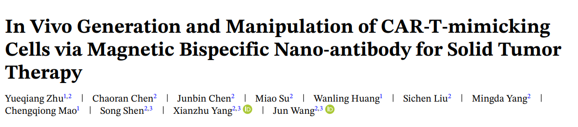 本研究开发了一种磁性双特异性纳米抗体(M-BiNanoAb),可通过静脉给药在体内与循环T细胞结合,将其原位改造为具备靶向与杀伤功能的CAR-T模拟细胞。该纳米抗体表面同时修饰抗CD3和抗PD-L1抗体,可分别模拟CAR结构的信号域与抗原识别域,使T细胞获得特异性识别并清除PD-L1高表达肿瘤细胞的能力。尤为关键的是,借助外部磁场引导,这些工程化细胞能够定向迁移并有效浸润至实体瘤内部,显著提升了肿瘤微环境中的T细胞聚集与活化水平。在黑色素瘤和乳腺癌等多种临床前模型中,该策略展现出超过90%的肿瘤抑制率,并能激发抗原表位扩散与长效免疫记忆,为实体瘤的免疫治疗提供了兼具靶向性、可控性与强效性的新途径。