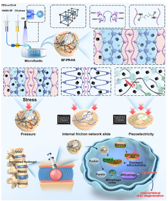 针对椎间盘退变等组织退化性疾病,其核心病理机制之一在于线粒体自噬失衡所引发的细胞凋亡与能量代谢紊乱。退变组织内源性电信号缺失,进一步加剧了细胞功能的衰退。近期,一项发表于《先进材料》的研究提出了一种创新的内摩擦网络压电水凝胶微球系统,通过恢复组织的生理电适应,为干预退行性病变提供了全新思路。