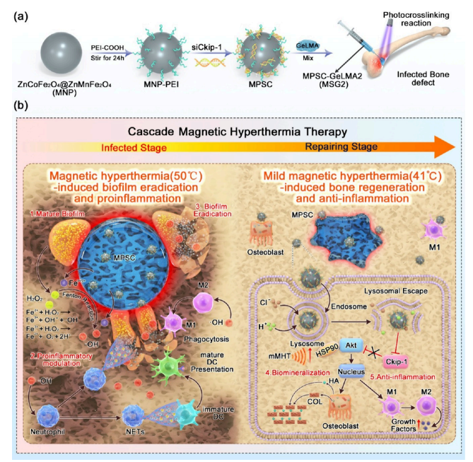 该研究团队设计并合成了核壳结构的ZnCoFe₂O₄@ZnMnFe₂O₄磁性纳米颗粒(MNPs),随后通过聚乙烯亚胺-羧酸(PEI-COOH)进行表面修饰,进一步吸附具有成骨与抗炎作用的小干扰RNA(siCkip-1),构建出MNP-PEI-siCkip-1(MPSC)纳米复合体。这些MPSC被包裹于光敏明胶甲基丙烯酰胺(GelMA)水凝胶中,形成纳米催化水凝胶复合物(MSG)。该体系在交变磁场(AMF)作用下可产生可控的磁热效应。