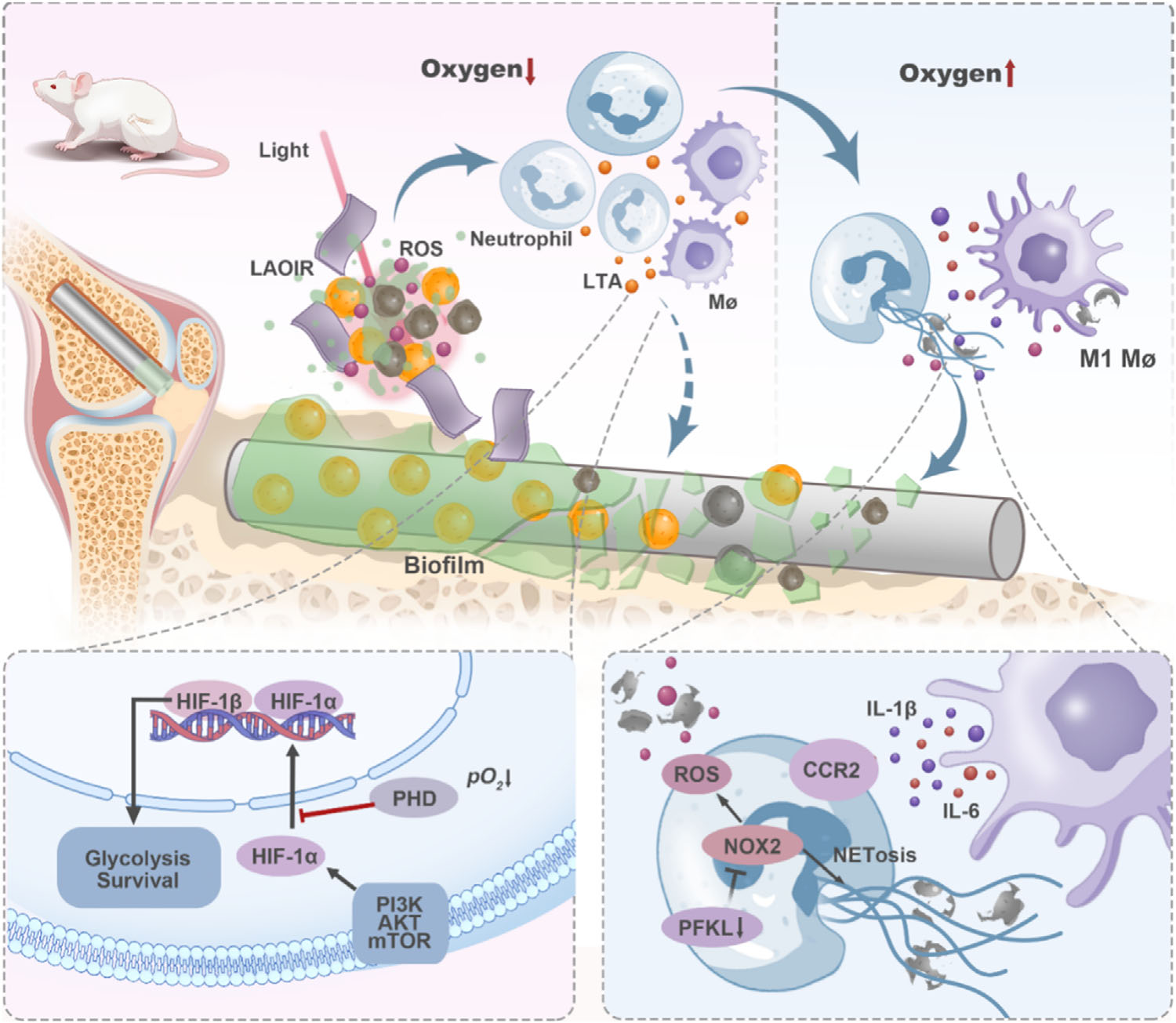 深入的研究揭示了一个精妙的“免疫开关”机制。在LAOIR治疗初期,其产生的活性氧直接攻击生物膜,而随之产生的缺氧环境暂时性地抑制了中性粒细胞等免疫细胞的吞噬功能和中性粒细胞胞外陷阱的形成。这种抑制并非削弱防御,反而是一种保护性策略。它延长了中性粒细胞的寿命,并通过上调HIF-1α激活AKT/mTOR通路,缓解了由细菌死亡后大量释放的脂磷壁酸所诱导的免疫细胞过度应激和后续的免疫耐受。本质上,缺氧环境将免疫细胞的应答暂时“关闭”,使其免于耗竭。