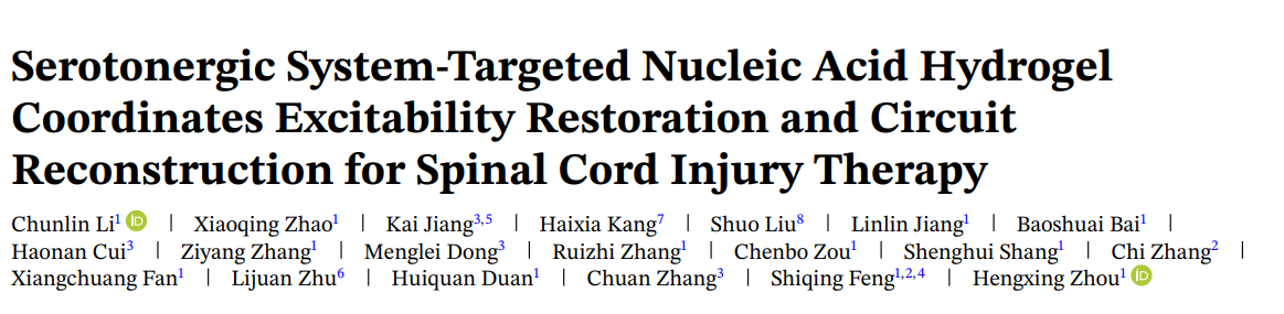 在脊髓损伤(SCI)的治疗领域,如何在结构修复与功能恢复之间实现协同,一直是转化医学的重大挑战。近期,一项发表于《先进材料》的研究提出了一种创新策略——通过靶向血清素系统的核酸水凝胶,同步实现神经元兴奋性恢复与神经环路重建,为SCI的整合治疗提供了新范式。