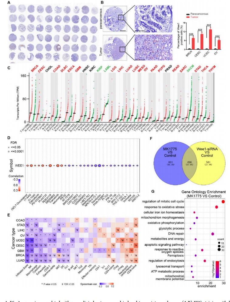 Wee1基因表达与不良临床结局相关并诱导转录组改变。(A,B)采用 IHC 染色技术对人类肿瘤组织微阵列(包括 BRCA 、 CESC 、 UCEC 和卵巢癌的癌旁组织及肿瘤组织)进行检测,结果显示癌区Wee1表达升高。目镜放大倍数:左图2倍;右图40倍。比例尺:左图500 μm ;右图100 μm 。数据以均值±标准差(SD)表示(n=10)。***P<0.001。(C)在 GEPIA 数据集中,Wee1 mRNA在大多数癌症类型中呈现过表达。不同部位肿瘤的缩写列于支持信息表S2。红色表示肿瘤高表达,黑色和绿色分别代表肿瘤未改变和低表达。T代表肿瘤组织,N代表癌旁组织。(D)根据 CTRP 数据库,Wee1表达与药物敏感性呈负相关。(E)基于 GSCA 数据集,Wee1表达与抑制性免疫微环境相关。(F,G)经Wee1抑制剂MK1775及选定siRNA处理的4T1细胞转录谱。