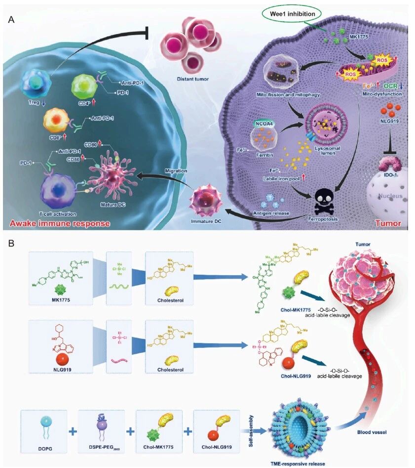(A) 体外实验中,MK1775对Wee1的抑制导致线粒体功能障碍、持续性活性氧(ROS)升高及随后的溶酶体激活。线粒体-ROS的增加通过协同作用于适应性升级的NCOA4-溶酶体降解系统,促进脂质体(LIP)释放并增强铁死亡易感性。Wee1抑制剂LN-MK1775的纳米制剂可促进肿瘤引流淋巴结(TDLNs)中树突状细胞(DCs)的成熟,当与PD-1抗体或IDO抑制剂等癌症免疫疗法联合使用时,其免疫激活潜力可被放大。(B) Wee1抑制剂刺激响应性纳米制剂策略示意图。MK1775前药(Chol-MK1775)通过自组装形成纳米制剂,该制剂可减少副作用,因其纳米药物能在肿瘤部位富集,且药物可在肿瘤部位弱酸性环境中受控释放。NLG919亦可与MK1775同时封装于纳米颗粒(NPs)中。双药纳米制剂LN-(MK1775+NLG919)可增强放疗诱导的体内铁死亡敏感性并改善远隔效应。