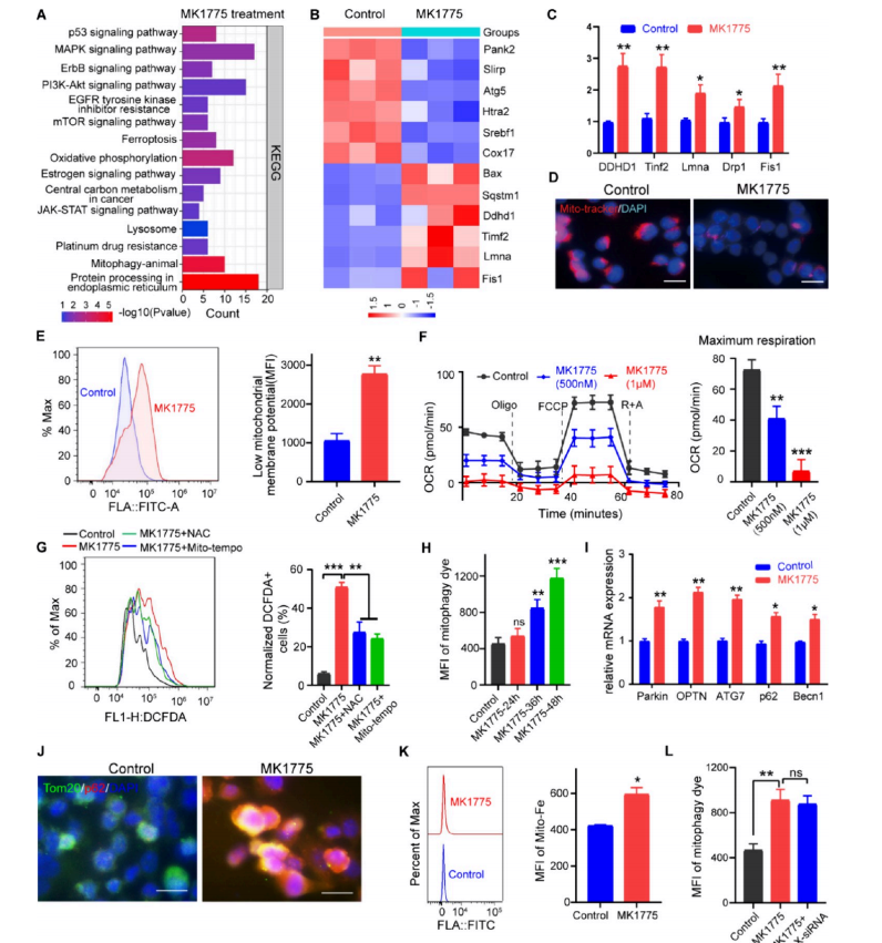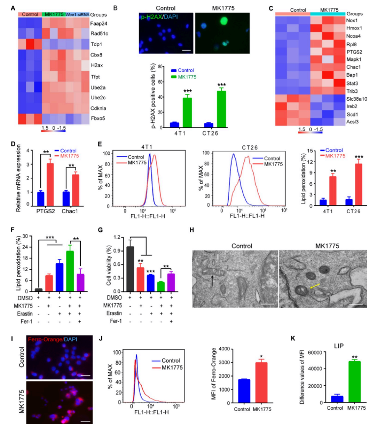 Wee1抑制增强了铁死亡敏感性。(A) 细胞周期和DNA修复调控基因的转录谱分析显示,MK1775或选定的Wee1-siRNA处理在4T1细胞中观察到富集的特征信号。(B) DNA损伤蛋白p-H2AX的免疫荧光染色表明,MK1775处理增加了4T1细胞和小鼠结肠癌CT26细胞的DNA损伤。(n = 10)。比例尺:10 μm ,***P < 0.001。(C) 根据铁死亡数据库FerrDb分析的铁死亡相关基因表达模式显示,MK1775处理在4T1细胞中上调了NOX1等促进铁死亡的基因表达,同时下调了SCD1等抑制铁死亡的基因表达。(D) 与对照组相比,MK1775组4T1细胞中铁死亡标志物PTGS2和Chac1的相对mRNA表达水平更高(内参: GAPDH)。(n = 3)。**P < 0.01。(E) 使用C11- BODIPY 检测探针分析发现,MK1775处理的4T1和CT26细胞中脂质过氧化积累更高。(n = 3)。**P < 0.01;***P < 0.001。(F) 在4T1细胞中,Wee1抑制与铁死亡诱导剂Erastin联用时增强了脂质过氧化。**P < 0.01;***P < 0.001。(G) 在4T1细胞中,Wee1抑制与铁死亡诱导剂Erastin联用时增强了肿瘤杀伤能力。(n = 4)。**P < 0.01;***P < 0.001。(H) 通过透射电子显微镜(TEM)观察MK1775处理对4T1细胞的形态学改变。比例尺:500纳米。(I,J)采用Ferro-Orange探针对4T1细胞(样本量n=3)进行免疫荧光染色及流式细胞术检测总亚铁离子浓度。比例尺:10 μm ,**P<0.01。(K)MK1775处理可显著提高LIP水平,该结果通过检测钙黄绿素-AM和/或去铁胺处理的4T1细胞 MFI 获得(n=3)。***P<0.001。数据以均值±标准差表示。