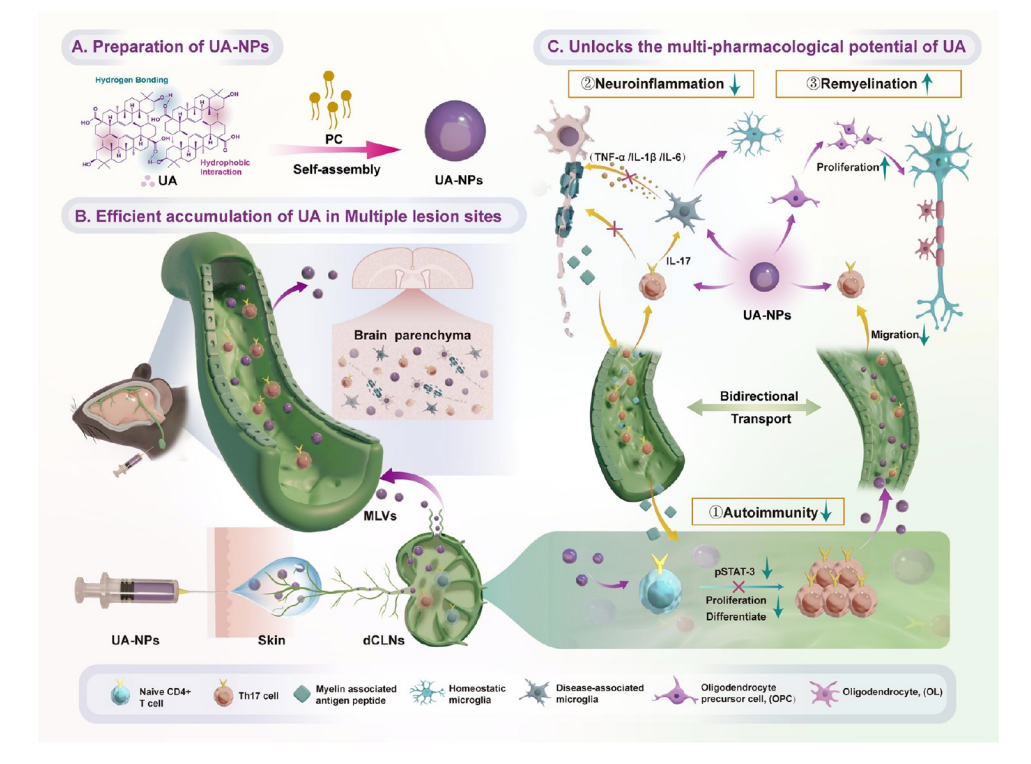 多发性硬化症(MS)是一种中枢神经系统(CNS)自身免疫性疾病,其特征包括外周免疫细胞的浸润、神经炎症和脱髓鞘。解决复杂的病理机制和空间多灶病变,包括深部颈淋巴结(dCLNs)、脑膜淋巴管(MLVs)和脑实质,仍是 MS 治疗中的一大挑战。本文介绍了一种简化的神经治疗策略,采用自组装的乌索酸纳米颗粒(UA-NPs),通过近颈皮下注射(n.s.c.)给药。该路径战略性地利用 dCLNs–MLVs 通路,其解剖学上与多发性硬化症病变的多焦点性相匹配,同时能够绕过血脑屏障。多条实验证据综合显示,n.s.c. UA-NPs 在 MS 相关的关键免疫界面,特别是 dCLNs 和 MLVs,以及脑实质中积累增强,显著优于静脉注射;(2)延长大脑停留时间(N.S.C. 48 小时对比静脉注射 8 小时),同时尽量减少全身暴露;(3)释放了乌索尔酸的多药理潜力,实现了免疫调节、炎症抑制和髓鞘修复,这些都与 MS 病理相符。因此,n.s.c. UA-NP 逆转了多种 MS 相关行为障碍,提供了一种极简却多功能的治疗范式,具有超越传统方法的空间精准度。