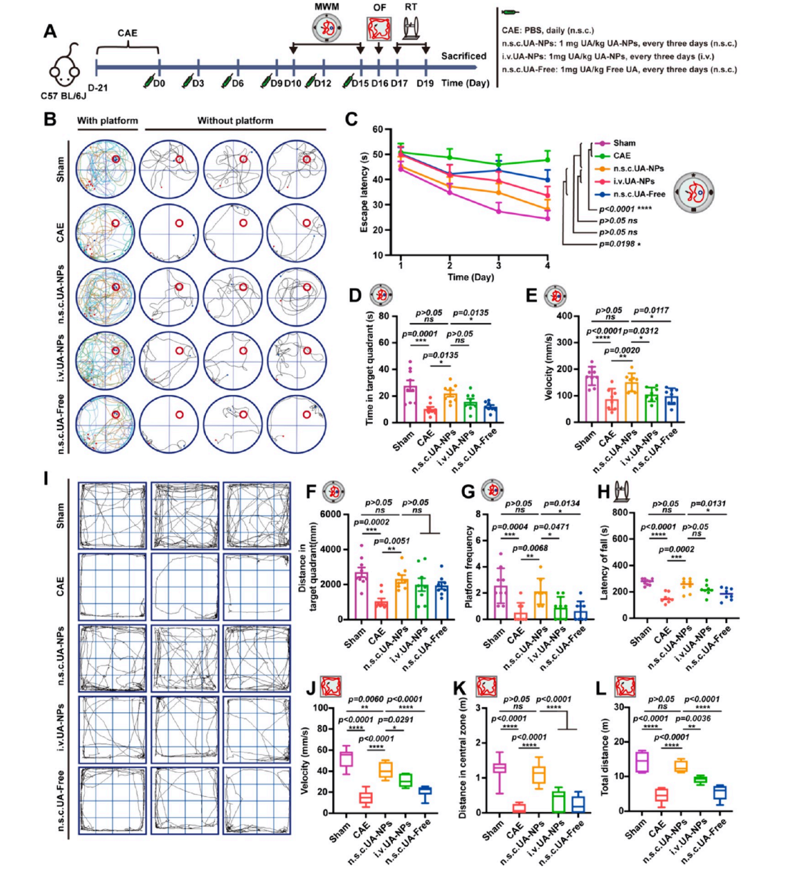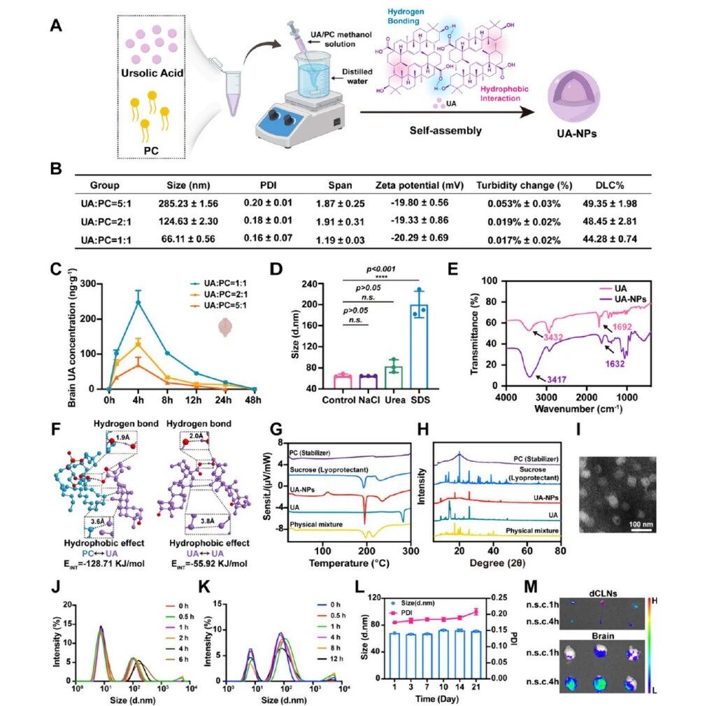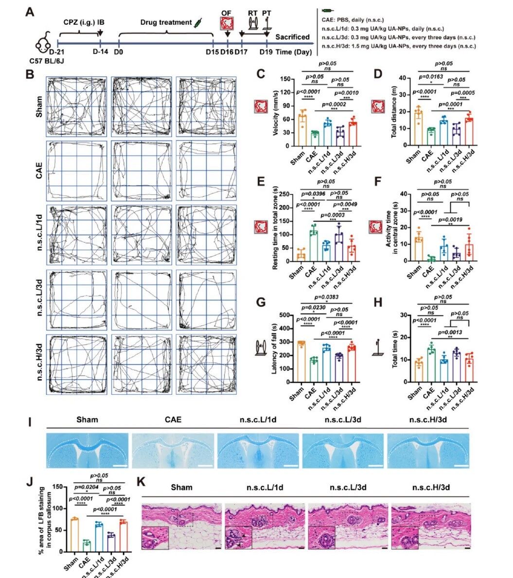 这篇发表于《ACS Nano》的研究开创性地提出了一种针对多发性硬化(MS)的精准纳米治疗策略。研究团队利用熊果酸(UA)自组装形成的无载体纳米粒(UA-NPs),通过近颈皮下注射(n.s.c.)的方式,巧妙利用了深颈淋巴结(dCLNs)-脑膜淋巴管(MLVs)这一解剖通路,实现了药物向脑内多病灶部位的靶向递送。这种递送方式不仅显著提高了UA在dCLNs、MLVs及脑实质中的富集,将脑内滞留时间从静脉注射的8小时延长至48小时,还大幅降低了全身暴露和脱靶效应。