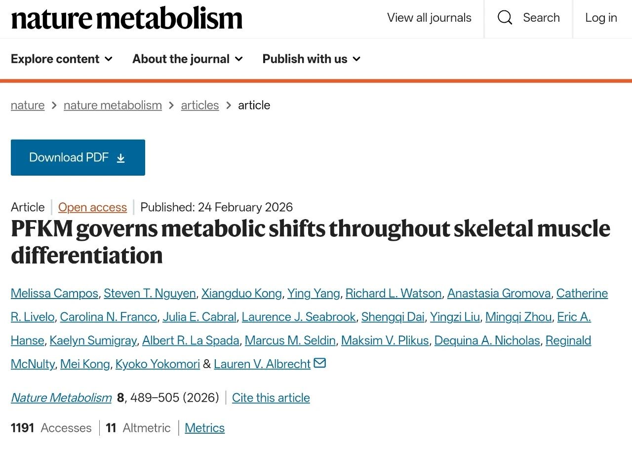 围绕肌肉干细胞向成熟骨骼肌分化的过程,聚焦PFK1肌肉亚型PFKM,解析其表达动态、上游调控通路,以及PFKM介导的葡萄糖代谢重编程对骨骼肌分化的调控作用。