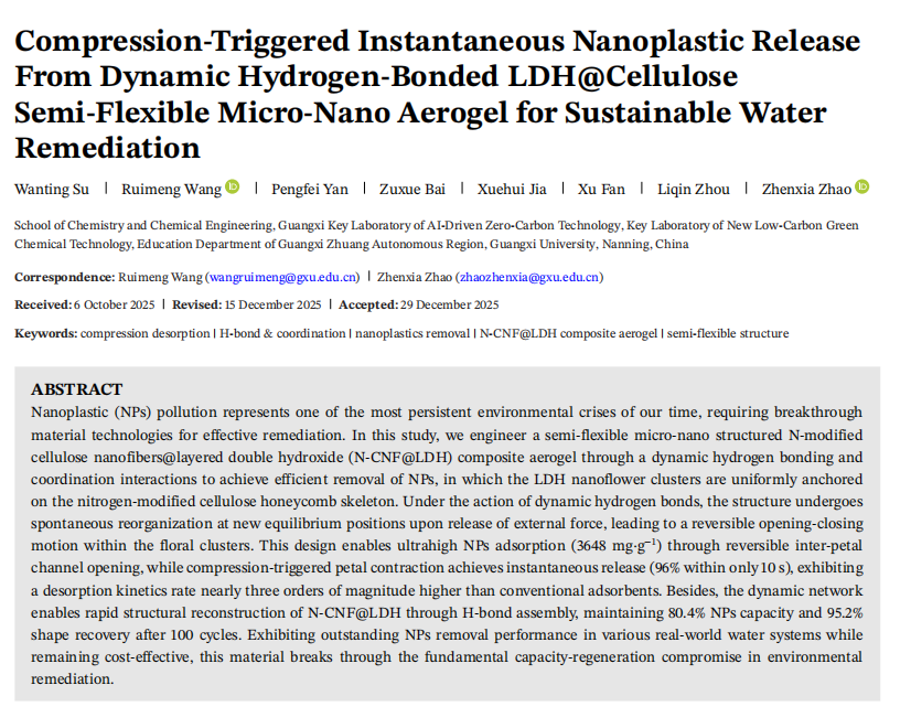 该研究以题为“Compression-Triggered Instantaneous Nanoplastic Release From Dynamic Hydrogen-Bonded LDH@Cellulose Semi-Flexible Micro-Nano Aerogel for Sustainable Water Remediation”发表在Advanced Functional Materials上。