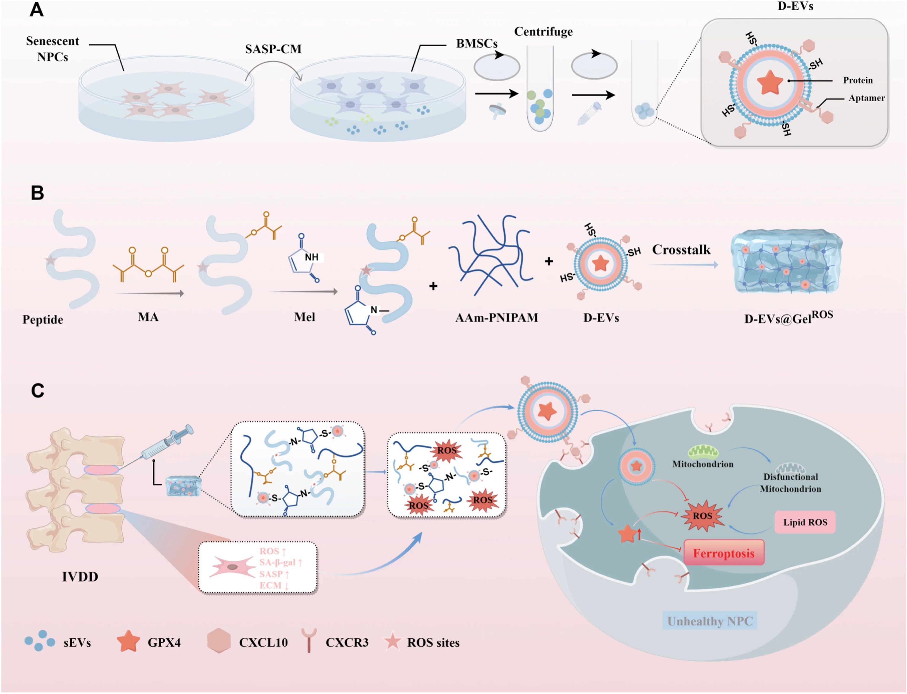 D-EVs负责携带GPX4等活性蛋白,靶向结合衰老髓核细胞,抑制铁凋亡;智能水凝胶提供三维支撑,实现D-EVs在退变局部的滞留与刺激响应性缓释,协同缓解细胞衰老。
