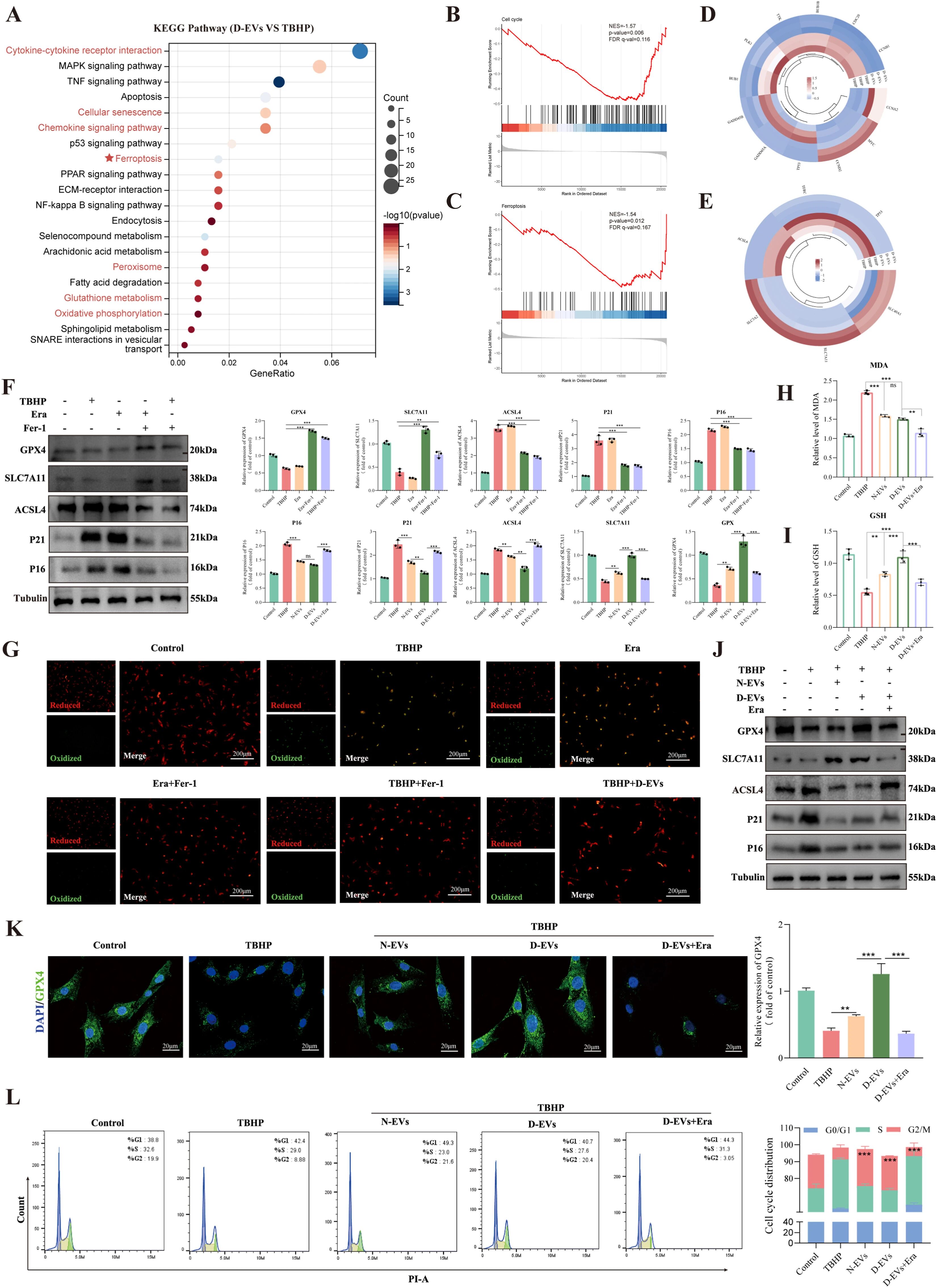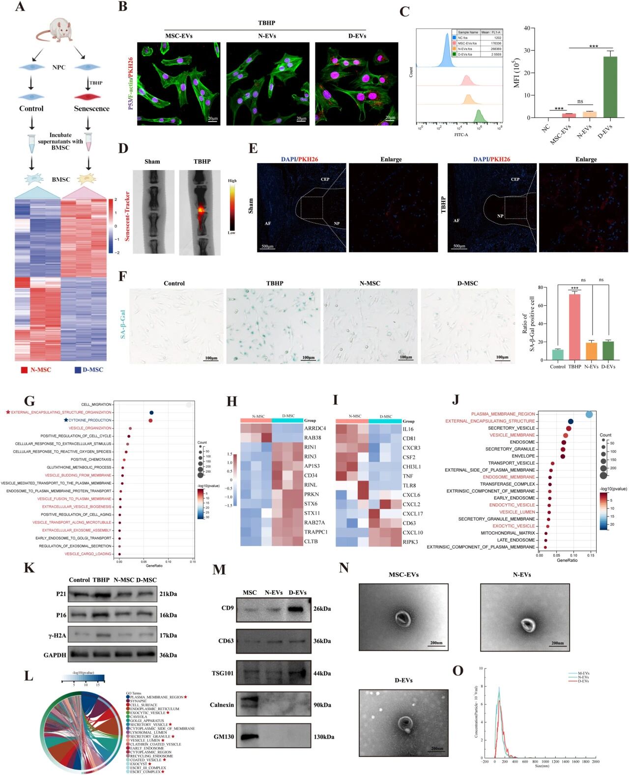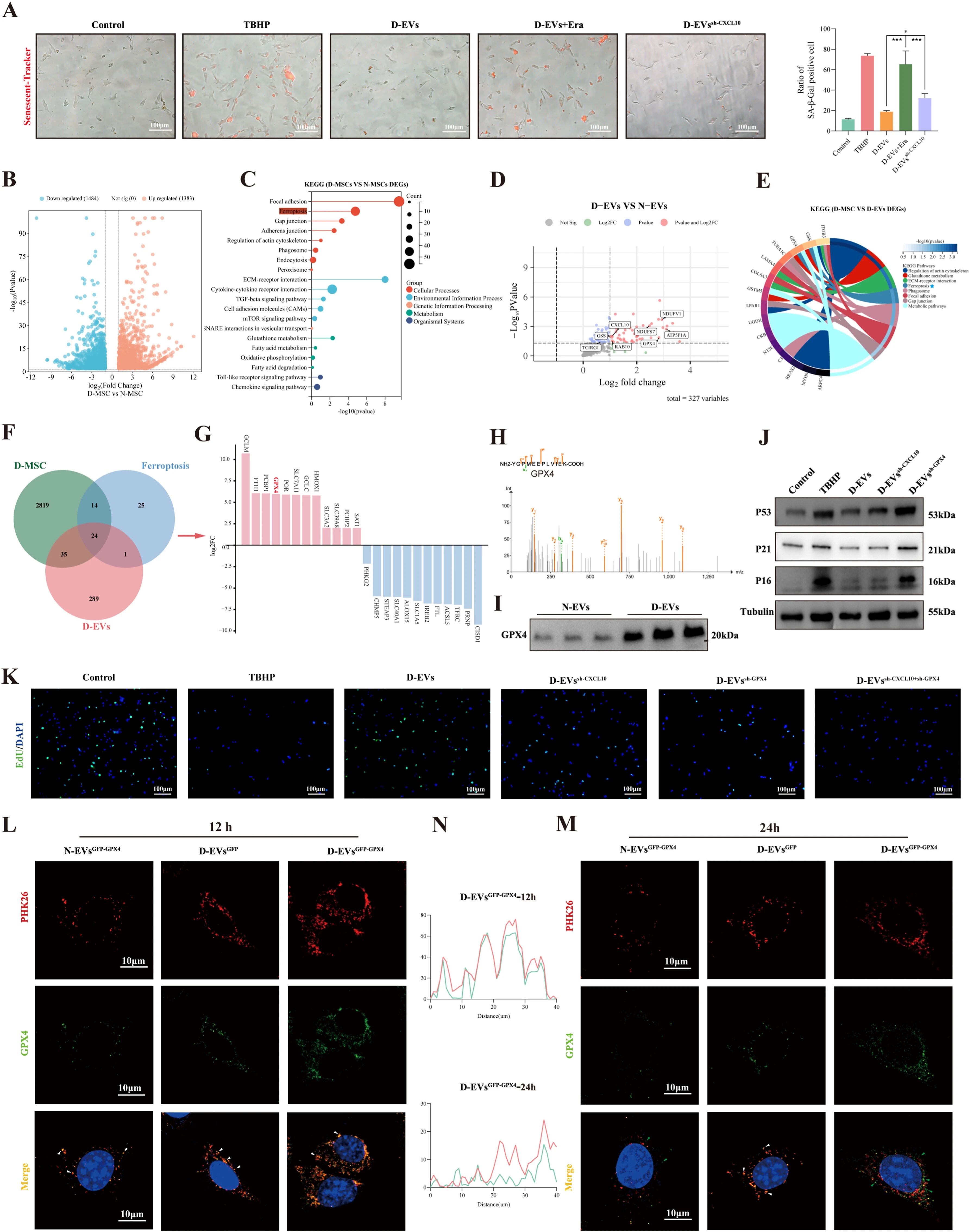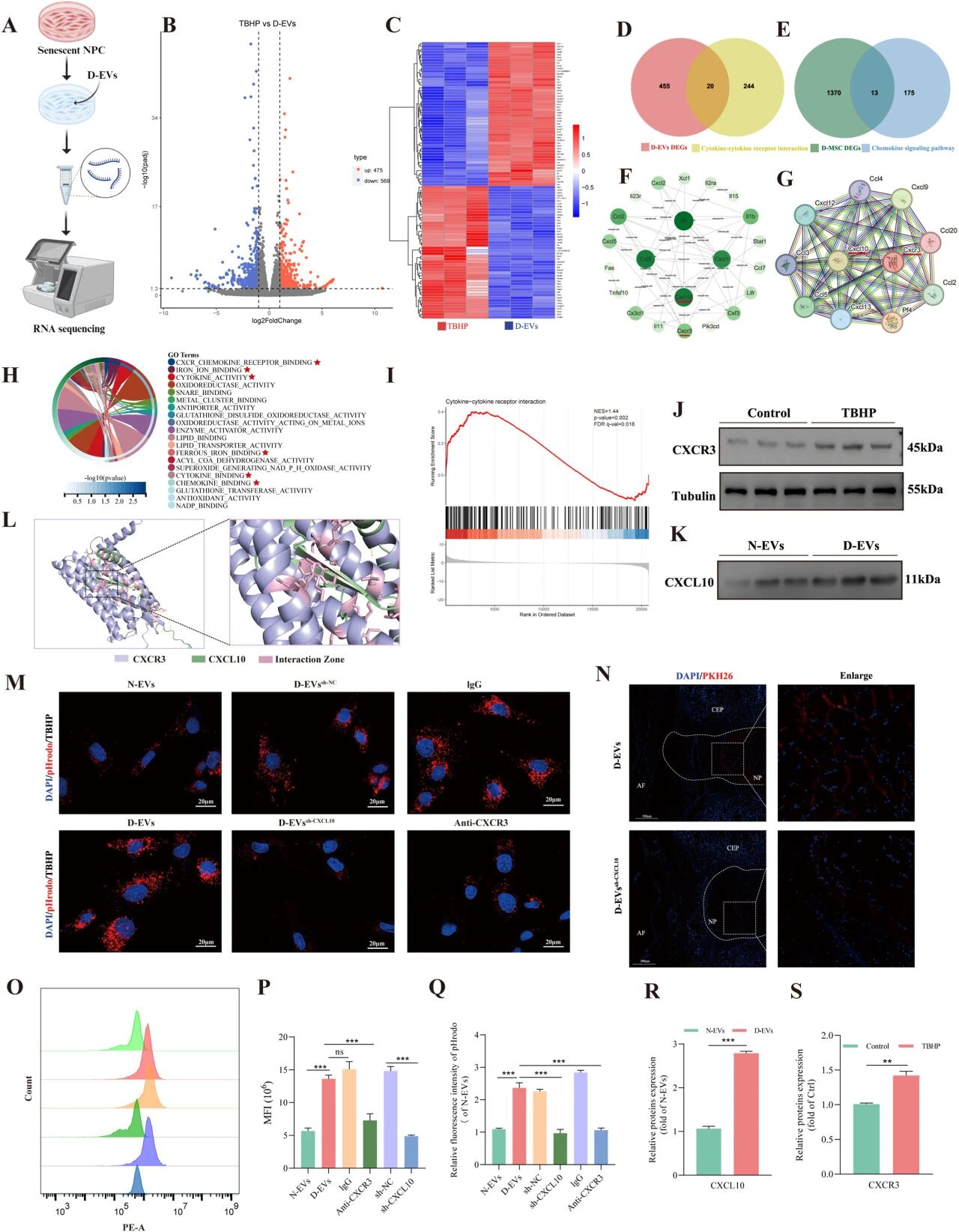 结合转录组与蛋白组学分析,明确D-EVs中GPX4蛋白的富集,并首次阐明其通过CXCL10-CXCR3趋化因子轴实现对衰老髓核细胞的特异性靶向。