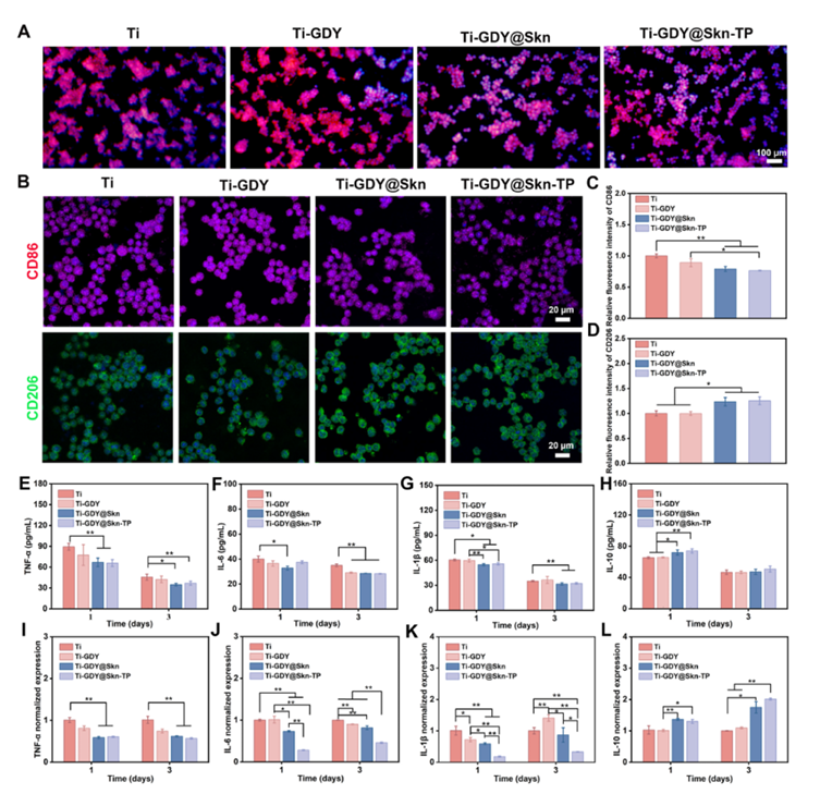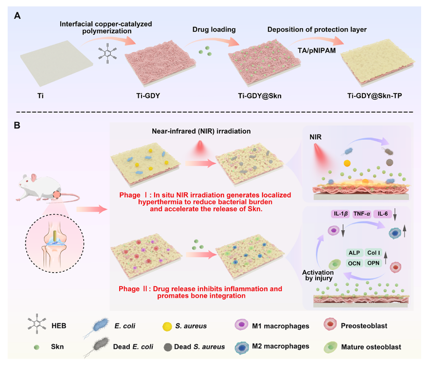 Ti-GDY@Skn-TP合成及其生物医学应用示意图。(A) Ti-GDY@Skn-TP多功能生物材料的合成路线。(B) Ti-GDY@Skn-TP在体内表现出抗感染和骨免疫调节的双重作用,有效改善骨种植体周围的界面成骨和骨整合。