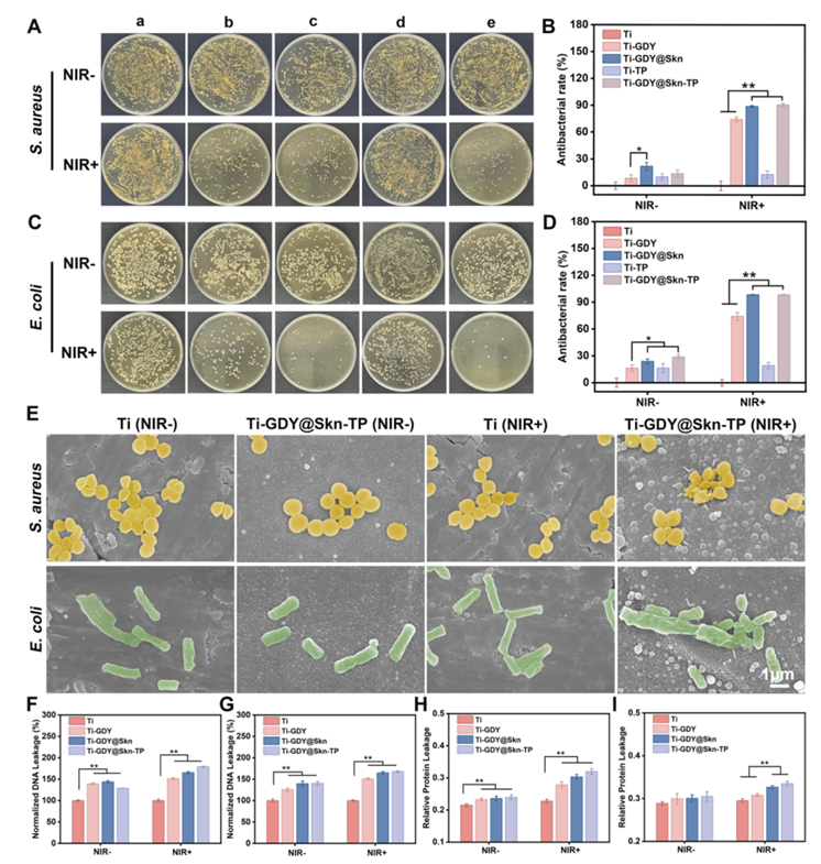 体外抗菌性能评价。(A, B)金黄色葡萄球菌和(C, D)大肠杆菌在不同底物上培养的代表性菌落图像和抑菌率:A) Ti, B) Ti- gdy, C) Ti-GDY@Skn, D) Ti- tp, e) Ti-GDY@Skn-TP。(E)金黄色葡萄球菌和大肠杆菌粘附在不同底物上的SEM图像。(F, G)不同处理后金黄色葡萄球菌和大肠杆菌dna渗漏和(H, I)蛋白渗漏。误差条表示n = 6时的平均值±SD, *p < 0.05, **p < 0.01。