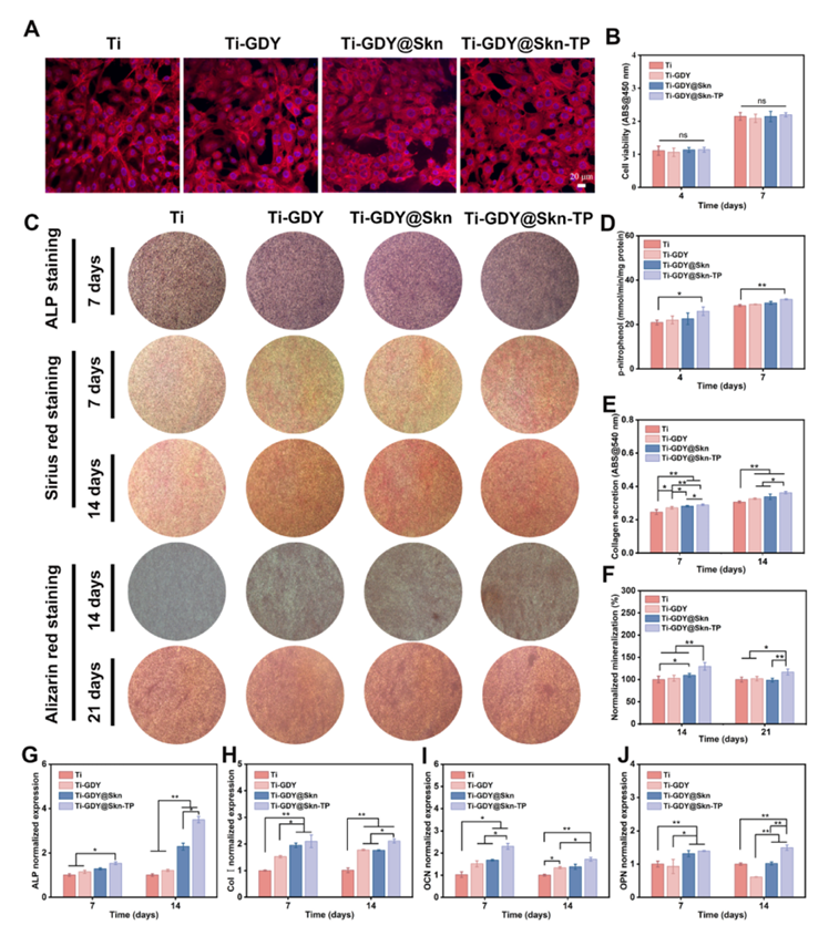MC3T3-E1细胞在不同样品上的体外成骨分化。(A) MC3T3-E1细胞在不同底物上培养48小时的代表性荧光图像。(B)培养4天和7天后CCK-8法测定细胞活力。(C) ALP染色、天狼星红染色和茜素红染色。(D-F)分别定量分析ALP活性、胶原分泌和ECM矿化。(G-J)成骨诱导7、14天后,RT-qPCR检测alp、OCN、Col I、OPN mRNA相对表达量。误差条表示n = 6时的平均值±SD, *p < 0.05, **p < 0.01。