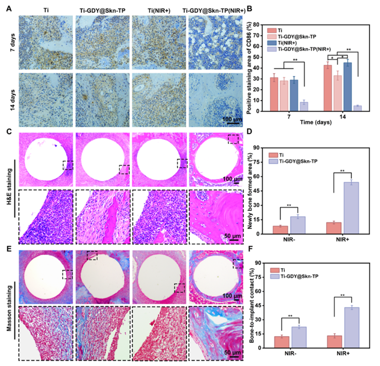 进一步的细胞实验表明,Skn的持续释放可有效调控巨噬细胞极化,促使其向抗炎型M2表型转化,降低TNF-α、IL-1β和IL-6等促炎因子分泌,同时上调IL-10表达,营造有利于骨修复的免疫微环境。体外成骨分化实验显示,Ti-GDY@Skn-TP涂层显著促进了MC3T3-E1细胞的黏附、ALP活性、胶原分泌及矿化结节形成,并上调ALP、OCN、Col I和OPN等成骨相关基因表达。在大鼠股骨缺损感染模型中,该涂层在NIR照射下有效清除植入物表面及周围组织的细菌,减轻早期炎症浸润,并在4周后显著促进新骨形成,提升骨-植入体接触率。组织学和免疫组化结果进一步证实其调控巨噬细胞极化和促进骨整合的能力。该系统还表现出良好的血液相容性和全身安全性。该研究为多功能钛基植入体的表面工程提供了新思路,兼具抗菌、免疫调节和成骨活性,具有广阔的临床应用前景。