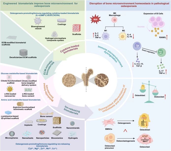 本综述针对骨质疏松性骨缺损的核心科研问题,聚焦病理性骨微环境对骨骼再生的抑制作用,突破传统生物材料分类的局限,构建了贴合骨骼微环境内在功能的生物材料分类概念框架。该研究将生物材料设计与骨微环境病理机制深度关联,明确生物材料作为病理微环境主动调节剂的核心定位,同时探索骨类器官与人工智能在研究模型中的应用,为骨质疏松相关骨再生研究提供了系统的理论框架与前瞻性研究思路。