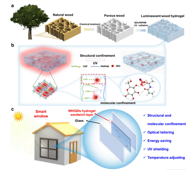 研究发现,该水凝胶体系展现出显著的协同纳米限域效应。一方面,木材骨架的多级孔道结构为量子点提供了物理限域空间,防止其聚集淬灭;另一方面,PNIPAM聚合物的酰胺基与纤维素羟基、量子点表面羧基之间形成的氢键网络,诱导量子点表面偶极极化并实现分子级钝化,显著减少了表面缺陷态的非辐射复合。这种结构与分子双重限域的协同作用,使WH/QDs水凝胶的光致发光强度显著高于单纯的PNIPAM/QDs水凝胶或多孔木材/QDs复合材料。此外,该水凝胶表现出可调谐的温敏发光行为,其机械性能也因氢键网络的增强而得到大幅提升。基于其各向同性的光散射特性和热致变色功能,研究团队进一步展示了该发光木基水凝胶在智能窗领域的应用潜力。该智能窗在低温下(<32°C)保持透明,允许阳光进入实现被动采暖;在高温下转变为不透明状态,有效阻隔太阳辐射并散射光线,实现室内温度调节。同时,量子点的引入赋予了材料优异的紫外屏蔽性能。该研究不仅深化了对木材纳米限域效应的理解,也为开发兼具光学调控与节能功能的先进木基功能材料提供了新思路。