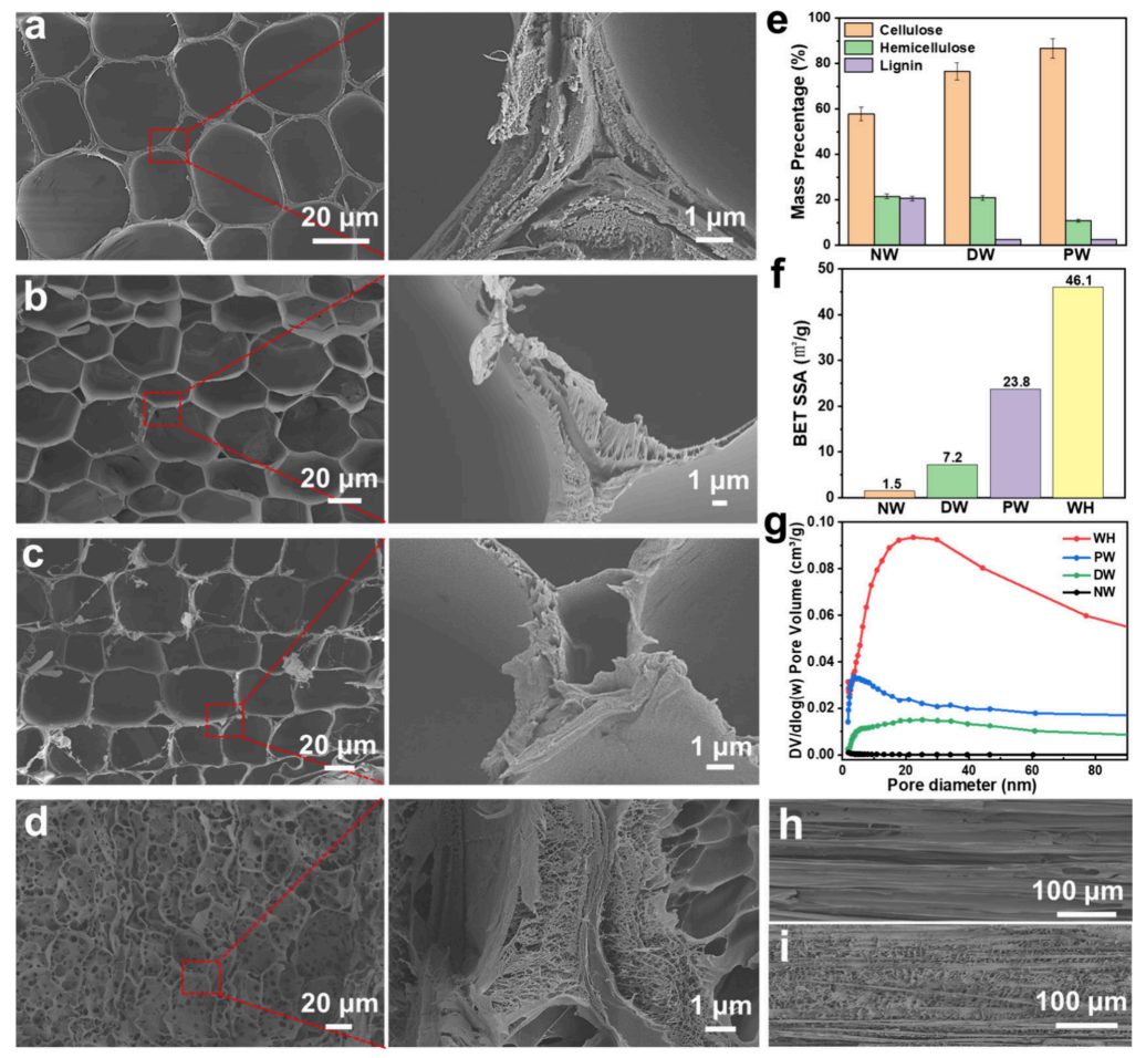 NW、DW、PW及WH的形态学与结构特征分析。(a) NW的横截面扫描电镜图像。(b) DW的横截面扫描电镜图像。(c) PW的横截面扫描电镜图像。(d) WH的横截面扫描电镜图像。(e) NW、DW及PW的化学成分分析。(f) NW、DW、PW及WH的比表面积(SSA)值。(g) NW、DW、PW及WH的孔体积分布。(h) PW的纵向截面扫描电镜图像。(i) WH的纵向截面扫描电镜图像。