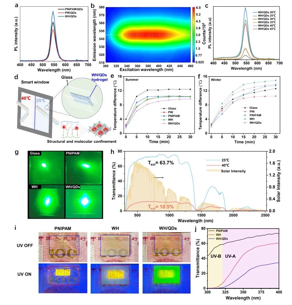 木质基水凝胶的光致发光特性与应用。(a) 含相同浓度量子点的WH、PW和 PNIPAM 水凝胶的光致发光强度对比。(b) WH/QDs体系发射波长与激发波长的二维等值线图。(c) WH/QDs在不同温度下的光致发光光谱。(d) WH/QDs水凝胶作为智能窗核心层的结构示意图。25℃和40℃下WH/QDs智能窗的紫外-可见透射率曲线。(e) 夏季使用不同夹层结构的智能窗温度差异对比(如图S28所示)。(f) 冬季使用不同夹层结构的智能窗温度差异对比。(g) 玻璃、纯 PNIPAM 水凝胶、WH及WH/QDs的光散射特性对比。(h) 25℃和40℃下WH/QDs水凝胶核心层智能窗在400-2500 nm波长范围内的太阳光强度与透射率实测值。(i) WH/QDs水凝胶紫外屏蔽性能的实验照片。(j) PNIPAM 、WH及WH/QDs水凝胶的紫外-可见光谱。