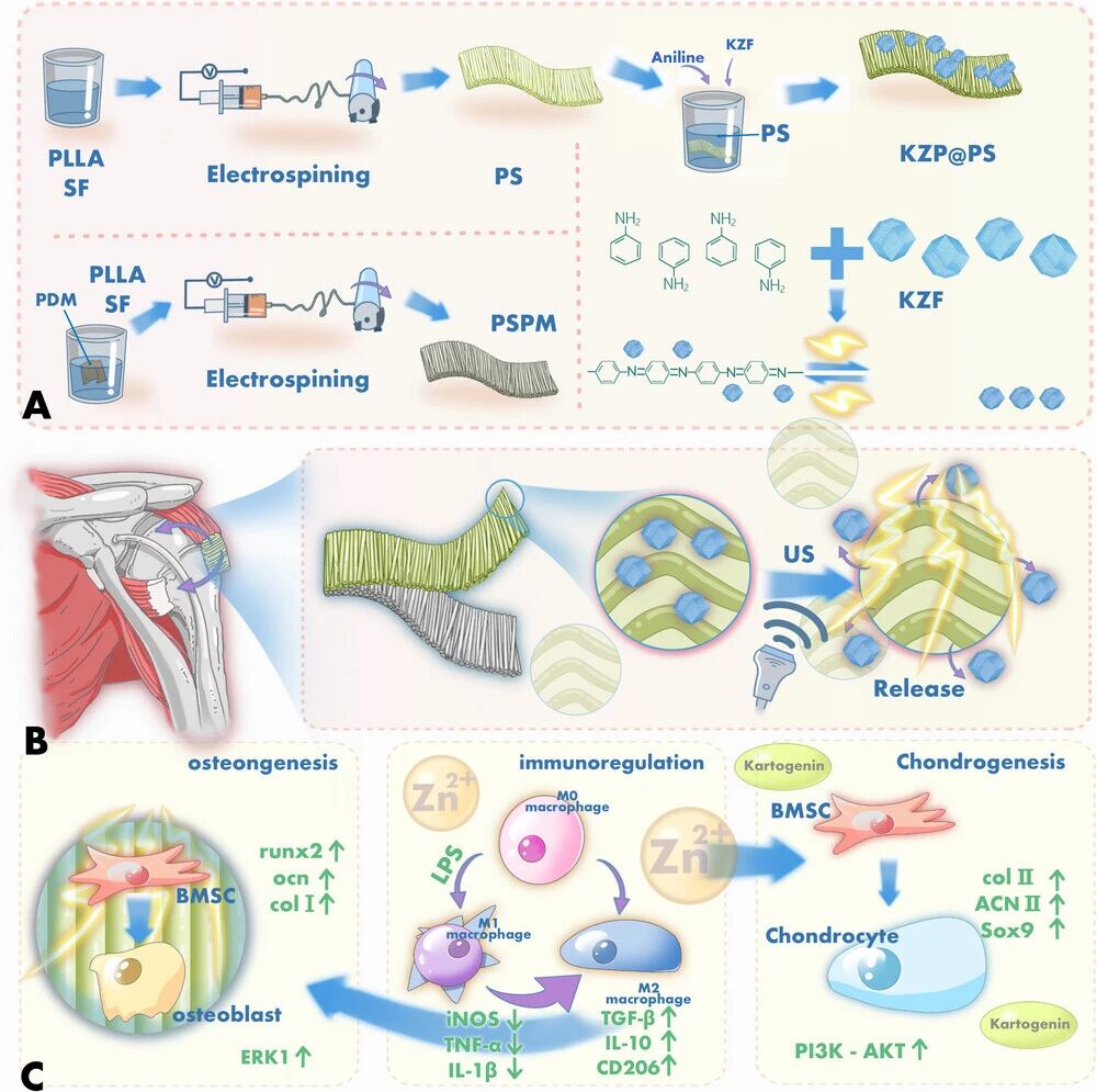 肩袖撕裂(RCT)是一种常见的运动损伤。目前的手术干预常导致愈合效果不佳,且无法再生复杂且异质的腱骨界面。压电材料将超声波产生的微机械能量转换为电信号,提供了克服传统电刺激疗法在肌肉骨骼组织修复中局限性的潜在手段。此外,主动且可控的药物释放在现代再生策略中变得越来越重要。我们开发了一种 Janus 双层纤维支(KZP@PS/PSPM),具有电旋和氧化聚合的双相诱导和免疫调节能力。在超声波照射下,PSPM 纤维膜将机械能转化为电信号,刺激骨髓间充质干细胞(BMSC)的骨质分化。同时,上层的 KZP@PS 层将机械能转化为电信号,激活聚苯胺(PANI)的电化学还原,并诱导应激反应性释放 KZF,KZF 分泌锌离子(Zn 2 ⁺)和卡尔托菌素(KGN),以促进免疫调节和软骨生成。该过程通过上调 ERK1 和 PI3K–Akt 信号通路,进一步增强了骨生成和软骨分化。在肩袖损伤模型中,KZP@PS/PSPM 复合支架显著降低了早期炎症标志物,并显著改善了肌腱与骨骼的愈合。通过协同“超声-电”与“电-药物释放”,这一 Janus 双层支架实现了双相诱导和免疫调节,为应对腱骨界面再生复杂挑战提供了新策略。