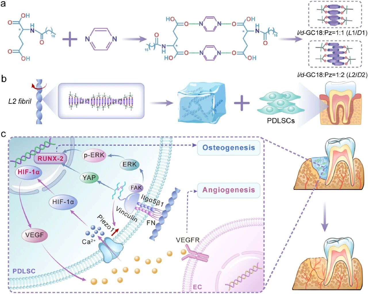 近期,一项发表于《Bioactive Materials》的研究为我们提供了一条新颖且充满潜力的解决路径:通过设计具有特定“左手螺旋”结构的超分子纤维材料,成功激活了牙周膜干细胞强大的成骨与成血管耦合能力,为下一代骨再生治疗绘制了清晰的蓝图。
