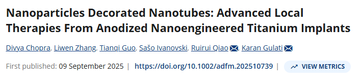 Advanced Functional Materials | 装饰纳米管的纳米颗粒:阳极氧化纳米工程钛植入物的先进局部疗法