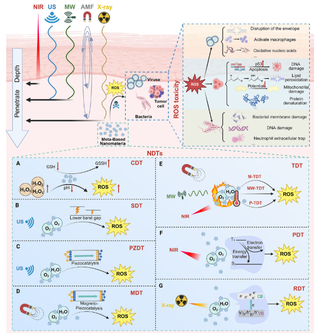 在肿瘤治疗领域,金属基纳米材料通过响应肿瘤微环境,在无需外部刺激或借助光、声、磁等外场作用下,即可催化产生活性氧物种,实现化学动力治疗。其中,以铁、铜等过渡金属为基础的纳米催化剂,可通过类芬顿反应将肿瘤内源性过氧化氢转化为高毒性的羟基自由基,选择性诱导肿瘤细胞氧化应激死亡。与此同时,光动力治疗、声动力治疗等策略则通过外部能量激发,突破传统治疗的组织穿透限制,实现对深部肿瘤的有效杀伤。尤其值得关注的是,压电动力治疗与磁动力治疗等新兴模式,利用机械能或磁场驱动电子-空穴分离,在缺氧条件下仍可持续产生活性氧,为克服肿瘤微环境限制提供了创新解决方案。