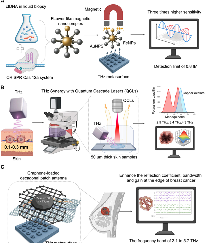 THz 技术因其物理性质,如非电离辐射、对水的敏感性和指纹识别,预计将为精准肿瘤学带来突破。然而,由于其缺点:穿透深度浅、解读困难和敏感性,其临床应用极为有限。本综述考察了近期跨学科进展,将 THz 技术与材料科学、纳米技术、人工智能(AI)、计算建模、基因编辑和微流控技术相结合,开发能够支持从肿瘤成像和生物标志物检测到治疗监测及药物递送评估的全肿瘤学连续体的智能诊断和治疗系统。例如,将 THz 与超材料或纳米结构结合,可以提升对微量生物标志物检测的敏感性;人工智能算法能够快速、准确地解读复杂谱数据以实现自动化诊断;与微流控和基于 CRISPR 系统的融合催生了超灵敏液体活检平台。这些综合方法不仅解决了现有技术障碍,还为实现具有实际临床价值的多功能治疗系统开辟了道路。通过促进跨学科合作,THz 技术可以进一步优化,实现更准确、有效和个性化的癌症护理,将其潜力从基础研究转变为现实世界的临床影响。
