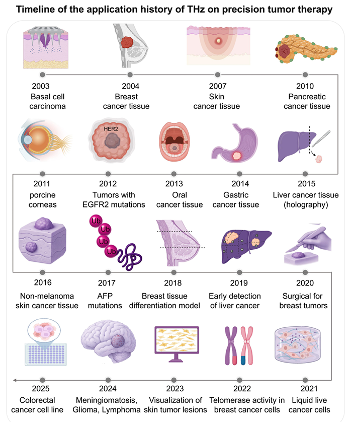 在THz技术用于精准癌症诊断的应用中,有一些关键的历史里程碑。最初的研究是对切除组织进行成像(基底细胞癌 2003,乳腺肿瘤 2004),随后十年的研究扩展到其他癌症(胰腺癌、口腔癌、胃癌)、生物标志物(HER2,2012)以及成像技术(数字全息成像 2015)。近年来,临床应用如手术切缘监测(2020)、液体活检分析(2021)或分子层面(如端粒酶活性调控)已成为前沿。近年来的发展,包括用于皮肤病变可视化的THz到红外转换器(2023),显示了高级工具整合的趋势。由此表明,THz技术已从实验室的好奇心演变为在医学界具有潜力的技术。