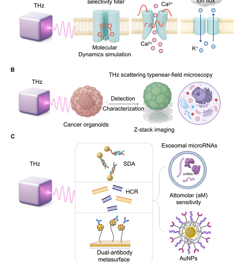 利用太赫兹实现细胞调制和超高灵敏度检测。A. 分子动力学模拟表明,太赫兹波可以直接与离子通道选择性滤器相互作用,改变其构象。这种相互作用可以增强钙通量或纠正钾通量失衡,为相关疾病提出了一种新颖的非侵入性治疗策略。B. 将太赫兹散射型近场显微镜与Z轴堆叠成像相结合,可以实现无标记、亚细胞分辨率的癌症类器官分析。这种方法无需荧光标记即可为高通量临床前药物筛选提供详细的结构信息。C. 达到液体活检所需的阿摩尔级灵敏度,需要将太赫兹生物传感器与信号放大策略相结合。诸如链置换扩增(SDA)、与金纳米颗粒(AuNPs)结合的杂交链反应(HCR)以及双抗体超表面技术等方法,使特定微RNA的超高灵敏检测成为可能。