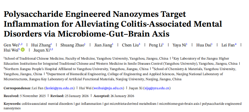该研究以题为“Polysaccharide Engineered Nanozymes Target Inflammation for Alleviating Colitis-Associated Mental Disorders via Microbiome-Gut–Brain Axis”发表在Advanced Materials上。