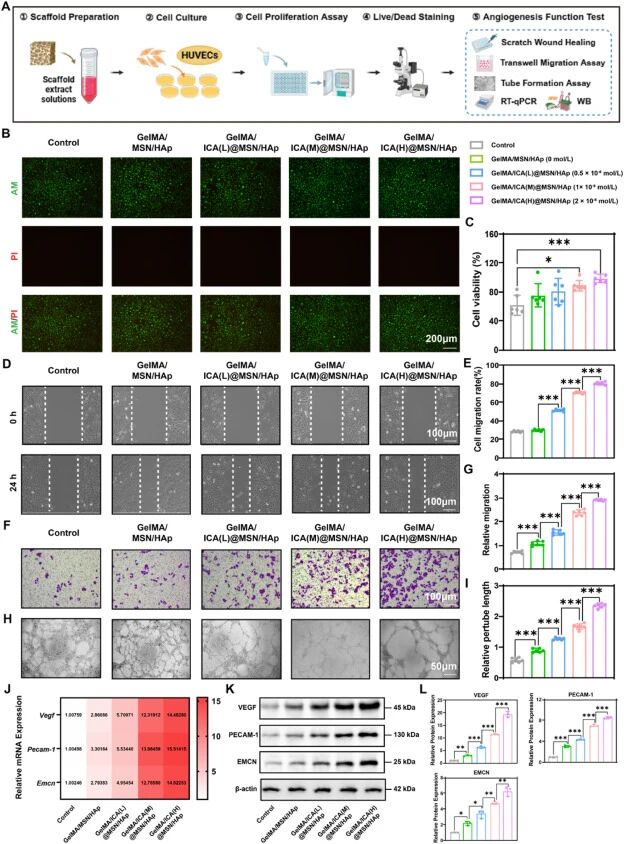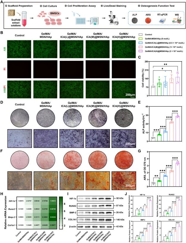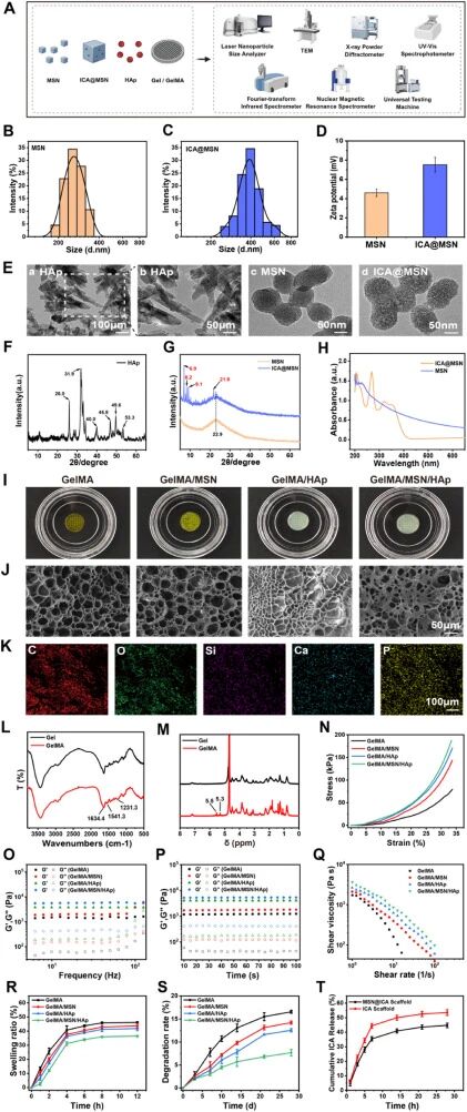 制备GelMA/ICA@MSN/HAp三维打印仿生支架;体外评估支架对相关细胞迁移、增殖及定向分化的影响;构建骨质疏松性骨缺损动物模型开展体内实验;结合转录组学分析明确核心调控通路。