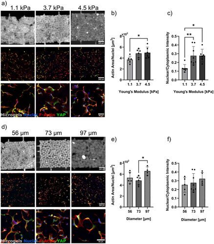不同刚度的微孔微凝胶可适配骨髓间质细胞的生长需求,材料刚度的提升可优化细胞扩散状态、激活相关细胞信号,同时强化细胞招募效应;在骨诱导因子刺激下,微凝胶上细胞的骨生成分化水平显著优于大块水凝胶体系;微孔微凝胶可通过刚度调控实现骨缺陷部位的细胞招募。