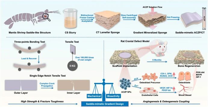 以螳螂虾鞍状结构为仿生原型,制备锌离子掺杂非晶磷酸钙/几丁质复合支架,探究其微观结构、力学性能、体外生物活性及骨缺损修复效果,通过分子测序解析支架介导骨再生的分子机制。