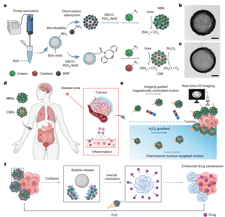 可生物降解微泡机器人的概览,它们具备高效自主推进、高成像对比度、靶向疾病部位导航及增强组织穿透能力。a,酶微泡机器人制备过程示意图。使用探针超声法制备了具有BSA壳的微泡;MBR通过静电吸附将MNP修饰在微泡上,然后通过点击化学固定尿素酶而制备。为了创建CBR,通过点击化学将尿素酶和过氧化氢酶共轭到泡表面。b,c,MBR(b)和CBR(c)的TEM图像。比例尺:200 nm。d,e,MBR或CBR适用疾病部位示意图(d),利用其可控推进能力,如MBR的成像辅助磁导运动和CBR靶向肿瘤区域的趋化运动(e)。f,FUS诱导药物载泡机器人坍塌及惯性泡空化示意图,旨在增强药物对肿瘤组织的渗透。图a及d–f由BioRender.com制作。