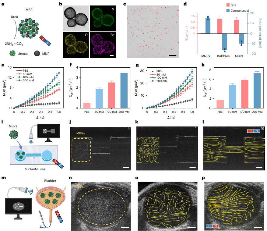 MBRs的表征。a,改性了脲酶和MNPs的MBR示意图。b,TEM和EDS映射图像显示MBRs中氮(N)、氧(O)和铁(Fe)的分布。比例尺:200 nm。c,明场与荧光图像叠加显示用Cy3标记脲酶修饰的MBRs。比例尺:10 μm。d,MNPs、裸气泡和MBRs的尺寸及ζ电位测量。误差条表示50个MBRs的均值标准差,以及尺寸和ζ电位的三次测量。e,f,MBRs在尿素溶液中的均方位移(MSD) (e)和有效扩散系数(Deff) (f)。g,h,MBRs在尿素溶液中受磁控下的MSD (g)和Deff (h)。e–h中的误差条表示15个MBRs的均值标准差。i,j,微流控室中含100 mM尿素的MBRs超声成像引导磁控推进示意图(i)及相应的超声图像(j)。比例尺:1 mm。k,l,PIV分析得到的流线模式超声图像,显示微流控室中MBRs在无(k)及有(l)外加磁场下的运动方向。比例尺:1 mm。m,n,小鼠膀胱内MBRs磁控推进的示意图(m)及实时超声成像引导下的超声图像(n)。比例尺:1 mm。o,p,PIV分析得到的流线模式超声图像显示小鼠膀胱内MBRs在无(o)及有(p)磁控下的运动。j–l及n–p的超声频率:50 MHz。比例尺:1 mm