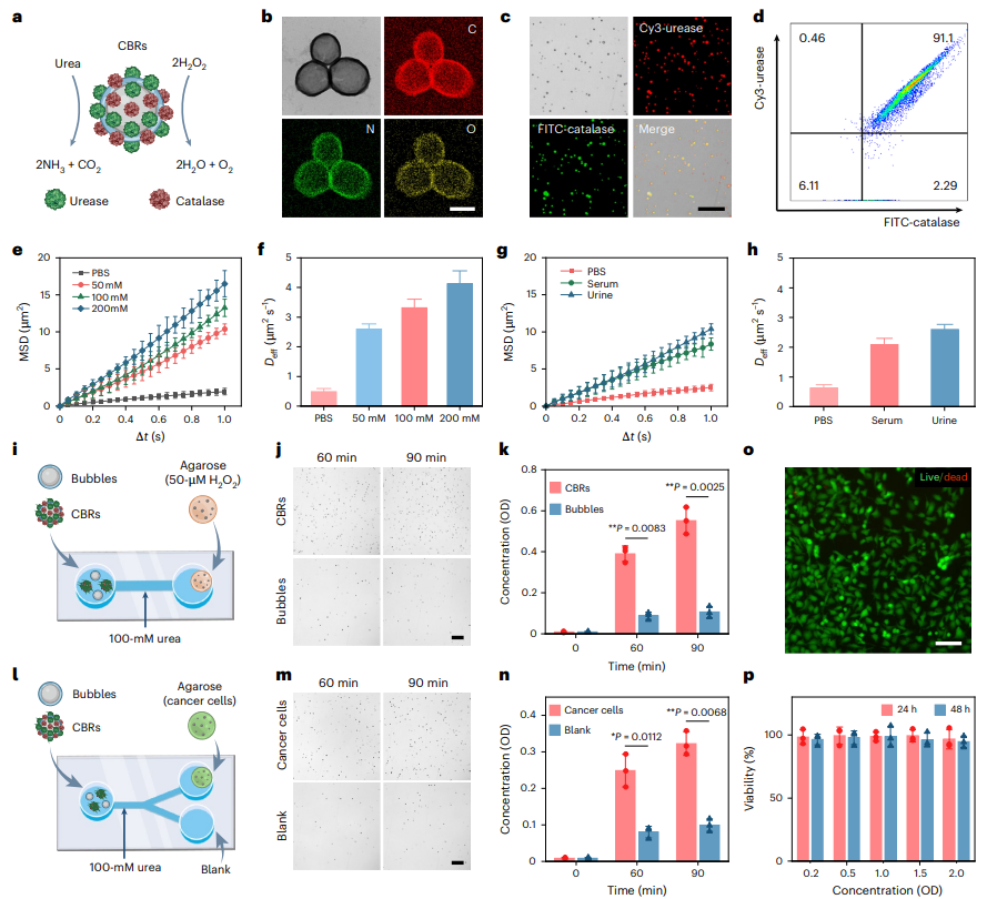CBR的表征。 a,带有尿素酶和过氧化氢酶修饰的CBR示意图。 b,透射电子显微镜(TEM)及能谱(EDS)映射图像,显示CBR中碳(C)、氮(N)和氧(O)元素的分布。比例尺:500 nm。 c,带有Cy3标记的尿素酶和FITC标记的过氧化氢酶修饰的CBR明场及荧光图像。比例尺:20 μm。 d,通过“点击化学”分析酶对CBR的修饰效率的流式细胞术。 e,f,CBR在尿素溶液中的均方位移(MSD, e)和有效扩散系数(Deff, f)。 g,h,CBR在PBS、含50 mM尿素的FBS及小鼠尿液中的MSD(g)和Deff(h)。 e–h中的误差线表示15个CBR的平均值标准差。 i,评估CBR在微流控室化学趋向运动的装置示意图,右侧储液槽中由含50 μM H2O2的琼脂糖凝胶形成H2O2梯度。 j,k,培养60或90分钟后右侧储液槽中的代表性光学图像(j)及CBR数量的定量(k)。OD,光密度OD500。1 OD ≈ 10^8 气泡/ml。比例尺:20 μm。 l,评估CBR在Y型微流控室化学趋向运动的装置示意图,右侧储液槽之一由含裂解T24膀胱癌细胞的琼脂糖凝胶形成H2O2梯度。 m,n,培养60或90分钟后两个右侧储液槽的代表性光学图像(m)及CBR数量定量(n)。比例尺:20 μm。 o,p,与CBR共培养2 OD 48小时的T24细胞的活(绿色)/死(红色)代表性图像(o)及以不同浓度CBR培养24或48小时后的细胞活力定量(p)。比例尺:100 μm。 k、n和p中的误差线表示三次测量的平均值标准差。 k和n中的统计分析使用配对双尾t检验。*P < 0.05,**P < 0.01