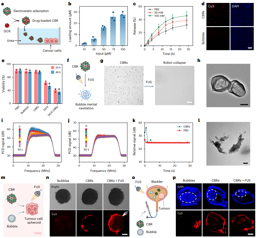 微泡机器人在药物负载、肿瘤结合和穿透方面的评估。a,针对靶向药物递送的多柔比星负载CBRs(DOX-CBRs)示意图。b,不同药物输入量下CBRs在4小时孵育后的负载量。c,DOX-CBRs在尿素溶液中的药物释放曲线。d,荧光图像显示Cy3标记的CBRs和裸泡在100 mM尿素中与T24膀胱癌细胞结合2小时后的情况。比例尺:100 μm。e,T24癌细胞在100 mM尿素中处理裸泡、CBRs、游离DOX及DOX-CBRs 2小时后,清洗并进一步培养22或46小时的细胞活力。b、c和e中的误差线代表三次实验的均值标准差。f,g,示意图(f)和显微镜图像(g)显示CBR在焦超声(FUS)刺激下的塌陷情况。比例尺:20 μm。h,TEM图像显示FUS处理后破裂的CBR壳体。比例尺:500 nm。i–k,单脉冲超声刺激下CBRs (i) 和PBS (j) 的回波频谱,采集时间为每秒一次,共30秒,以及对应的平均宽带信号 (k)。l,TEM图像显示破裂CBR壳在0.25%胰蛋白酶处理12小时后的降解情况。比例尺:500 nm。m,n,示意图(m)和荧光图像(n)显示Cy3标记的裸泡、CBRs及孵育后暴露5秒FUS的CBRs在100 mM尿素中与T24细胞球结合和穿透2小时后的情况。比例尺:100 μm。o,p,示意图(o)和荧光图像(p)显示在肿瘤膀胱中,Cy3标记的裸泡或CBRs经2小时膀胱内注入后的分布情况。CBRs孵育2小时后施加FUS。肿瘤膀胱用DAPI(蓝色)染色。白色虚线标出肿瘤位置。比例尺:1 mm。