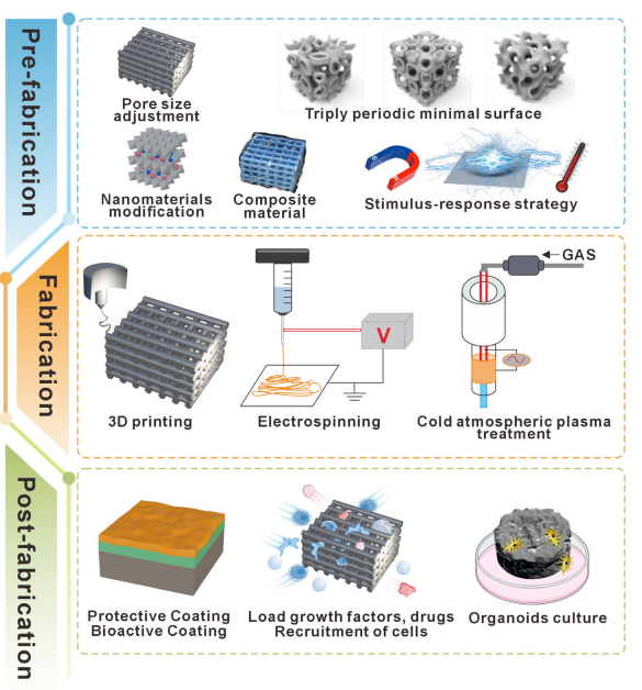 可吸收材料在不同阶段的常见改性策略。在预制阶段:结构设计、表面改性、复合配方和刺激响应工程。在制造阶段:等离子处理和高分辨率三维打印。在后制阶段:用于控制降解、成骨和炎症调节的功能涂层。经许可转载 [121]。版权 2022,Wiley-VCH