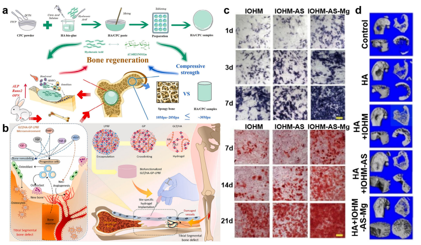 用于骨科应用的基于HA的可吸收材料。(a) 使用HA/CPC复合材料增强成骨基因表达并支持骨修复的示意图。经许可转载 [181]。版权所有 2021, Elsevier。(b) GLT/HA-GP-LPRF治疗节段性骨缺损机制的示意图。经许可转载 [184]。版权所有 2024, Elsevier。(c) 不同水凝胶与BMSCs体外共培养的ALP染色(上)和ARS染色(下)。(d) 不同组股骨骨质疏松缺损的微CT图像。经许可转载 [185]。版权所有 2024, Elsevier