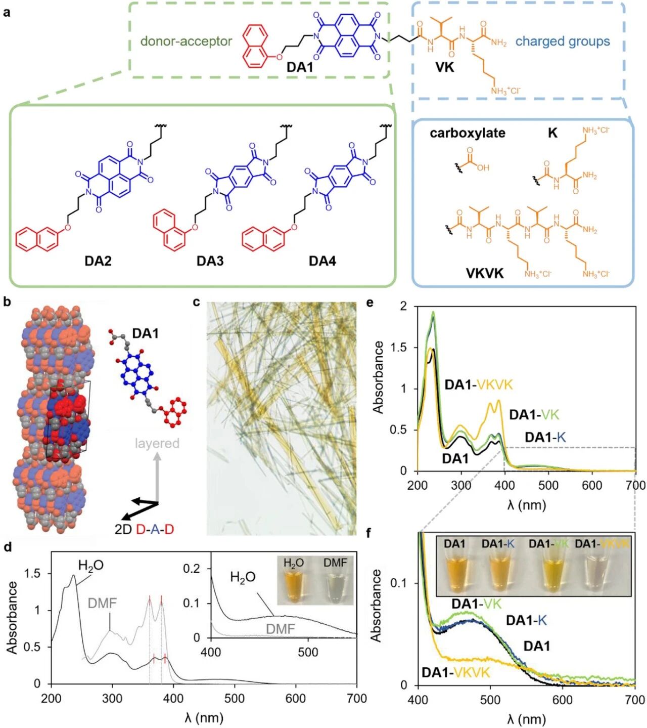 供体-受体肽两亲物的分子结构及自组装。a,DA-PAs的分子结构,包括通过三碳烷氧基连接子与PMDI或NDI受体相连的萘供体。受体单元通过三碳连接子与四种带电基团之一相连:羧酸盐、酰胺端赖氨酸(K)、酰胺端缬氨酸-赖氨酸(VK)或酰胺端四肽VKVK。b,通过DMSO缓慢蒸发获得的DA1单晶晶体结构(受体部分显示为蓝色,供体部分显示为红色,晶体形成层状结构,层内DA分子呈头尾排列,并形成供体-受体堆叠)。c,DA2晶体的照片(DA1晶体指标见图S4)。d,DA1溶于DMF(黑色曲线)或含1当量NaOH的水溶液(灰色曲线)的紫外-可见吸收光谱(插图为紫外-可见吸收光谱的电荷转移区域及1 mM水溶液和DMF溶液的照片)。e、f,含1当量NaOH的DA1水溶液、DA1-K、DA1-VK和DA1-VKVK的紫外-可见吸收光谱(e),以及e中电荷转移区域的放大光谱(f)(插图为1 mM水溶液的照片)。
